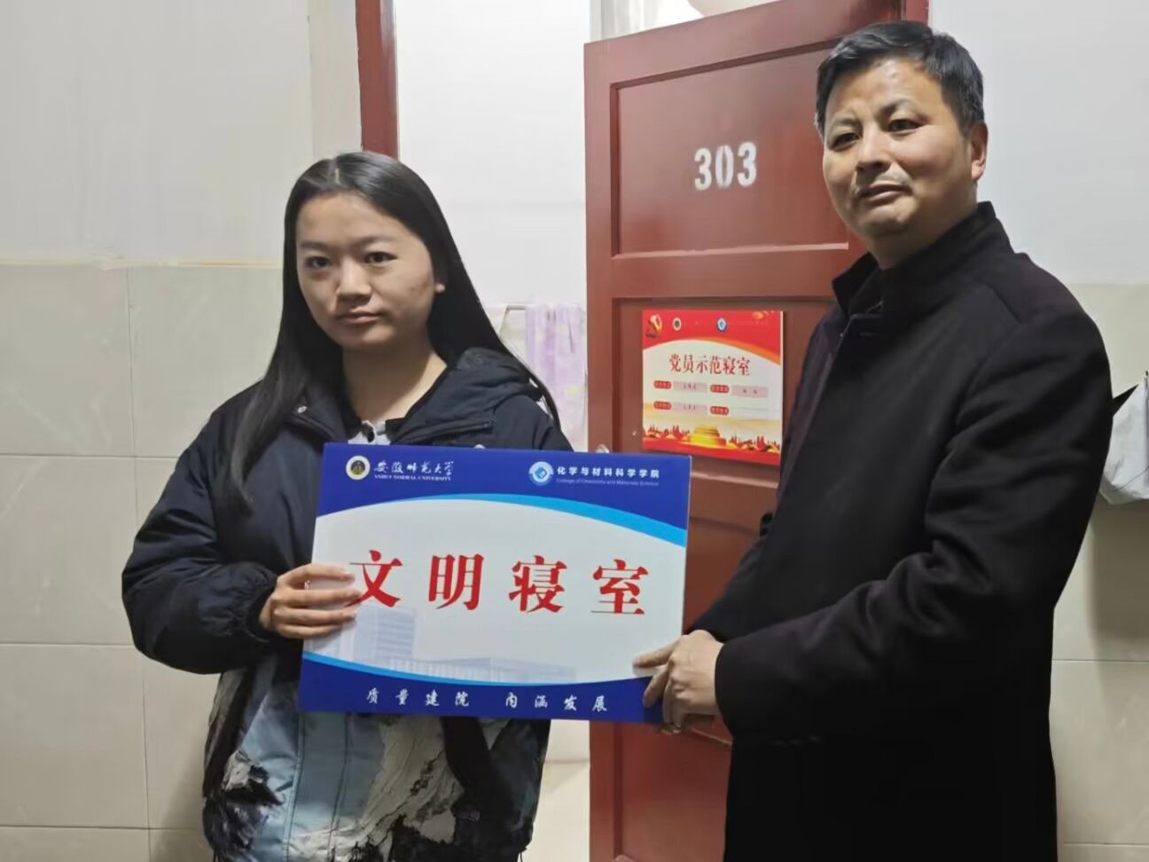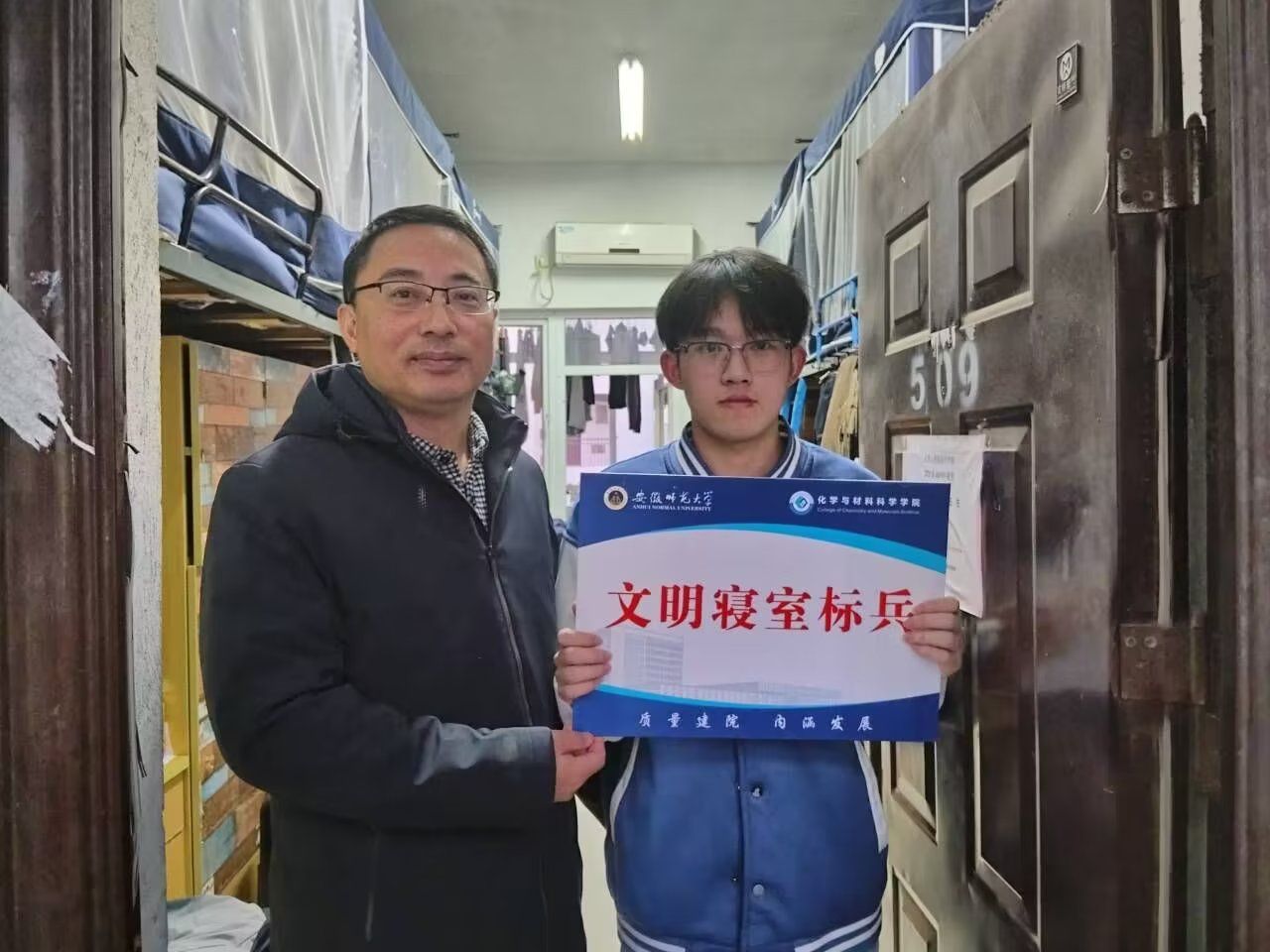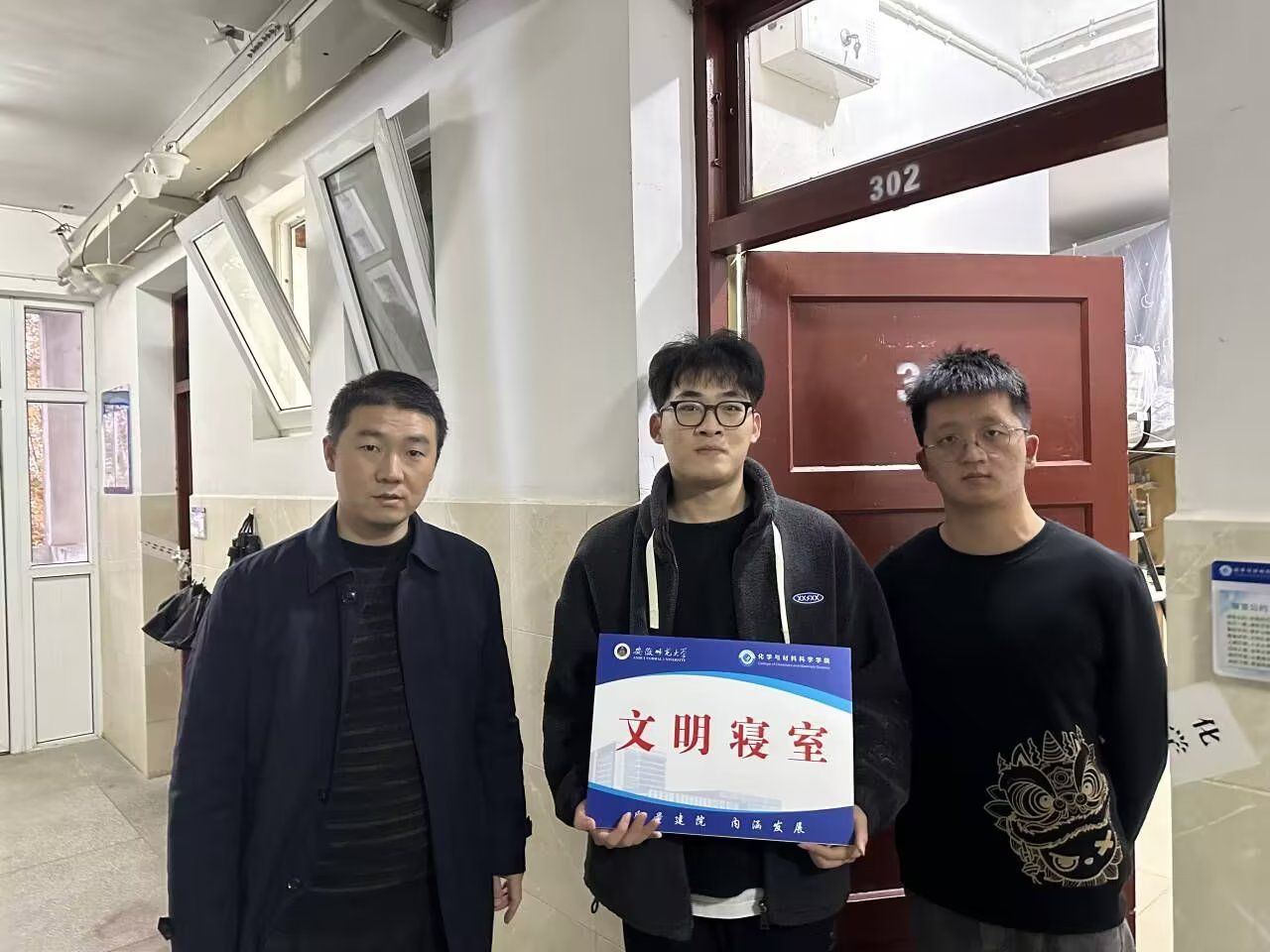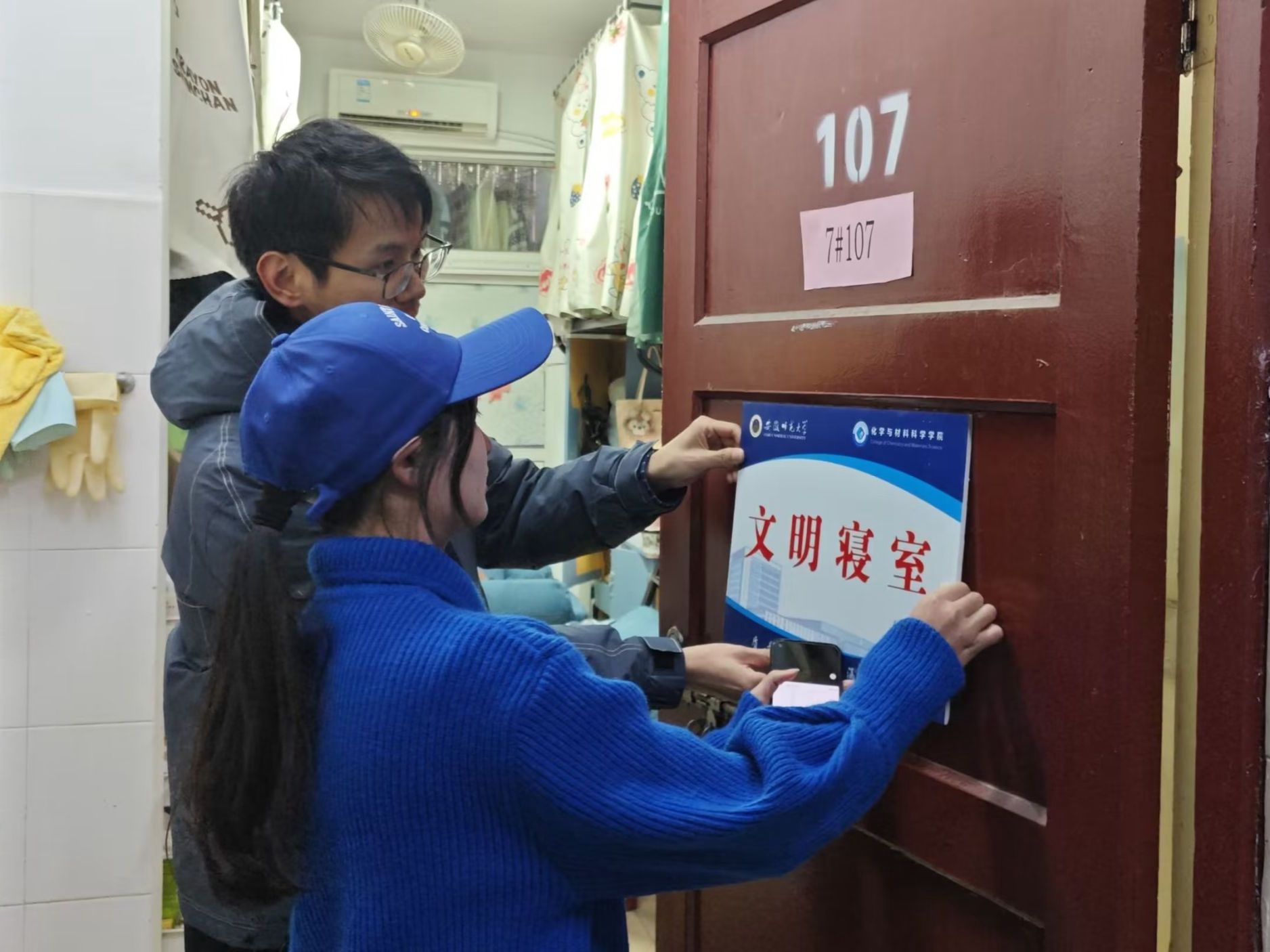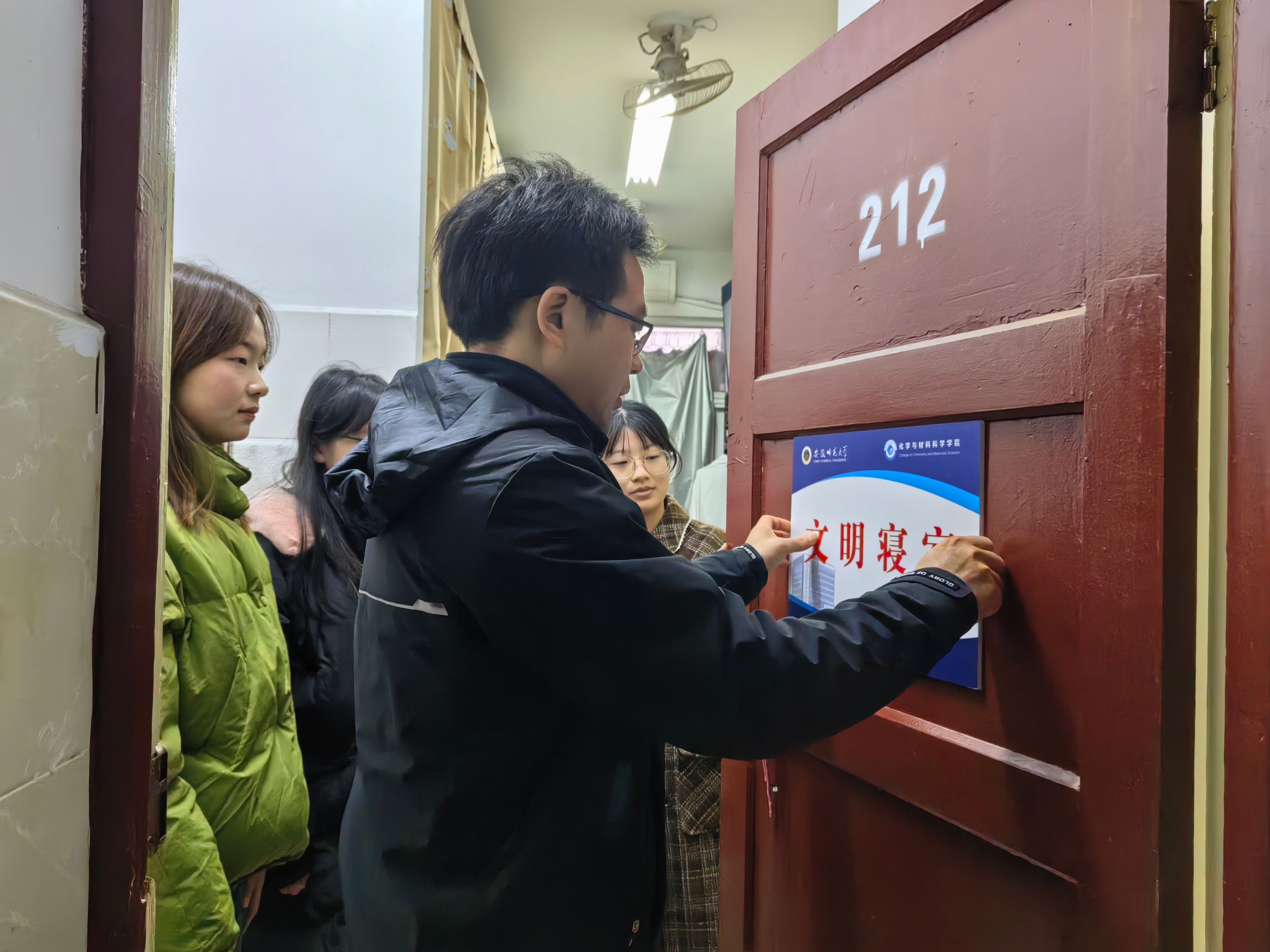 领导老师们深入学生宿舍,为文明寝室挂牌、亮身份,在挂牌过程中强调,作为文明寝室的一员要在和谐宿舍创建工作中充分发挥先锋模范作用,以实际行动影响和带动其他学生养成良好的行为规范,努力营造干净舒适的学习生活氛围,促进学风建设和学生健康成长。学生们也立志严格要求自己,遵守各项规章制度,加强室风建设,彰显化材学子青春风采。