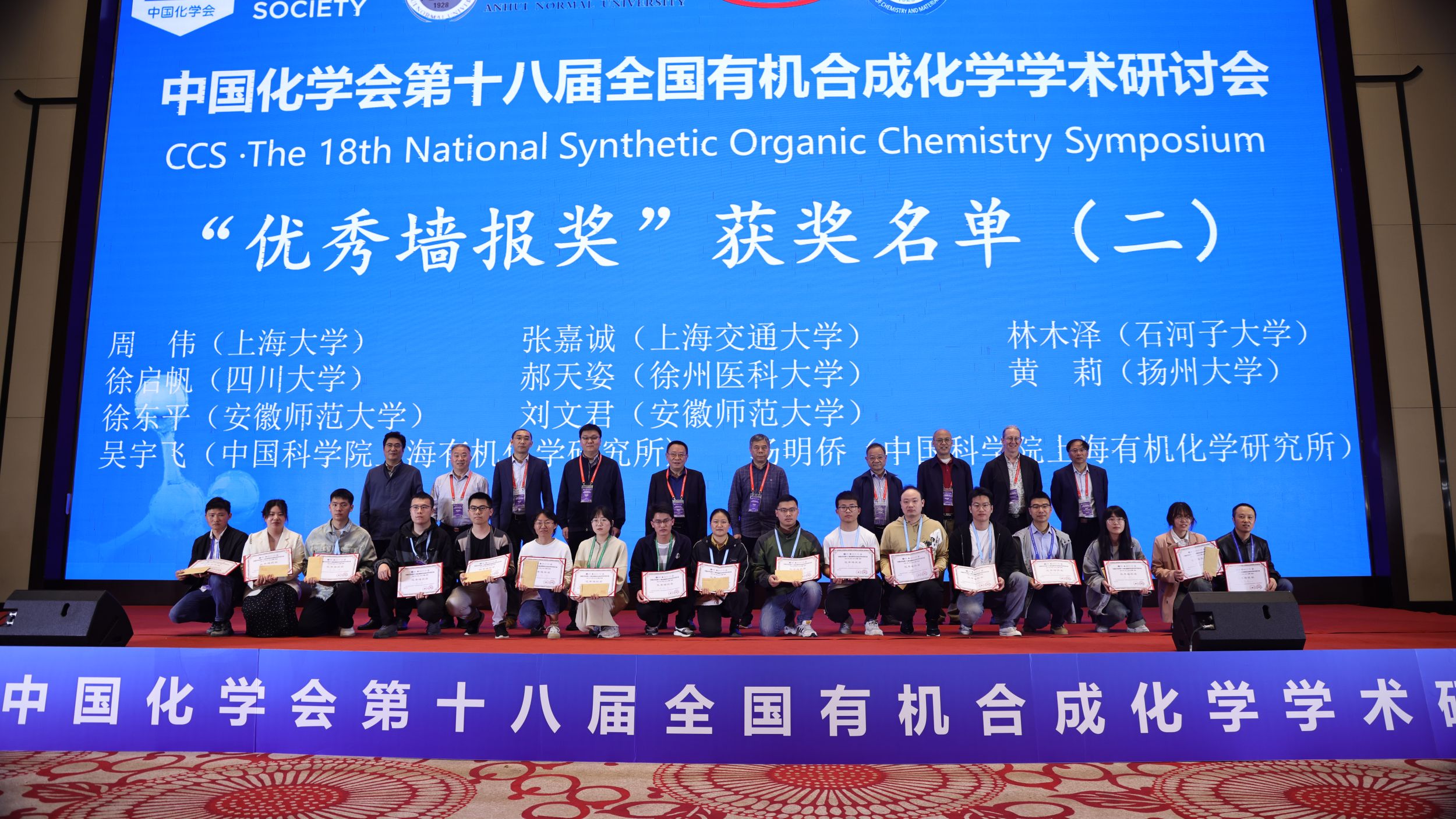 20日上午,大会举行闭幕式。组委会副主任、安徽师范大学/中国科技大学教授王官武主持闭幕式,高峰教授宣读了中国化学会第十八届全国有机合成化学学术研讨会“优秀墙报奖”获得者名单,并与Patrick J.Walsh教授、黄培强教授、叶新山教授、舒兴中教授、赵刚研究员、南开大学陈永胜教授、西南大学周成合教授、苏州大学姚英明教授、重庆大学闫海龙教授为20名“优秀墙报奖”获得者颁奖。