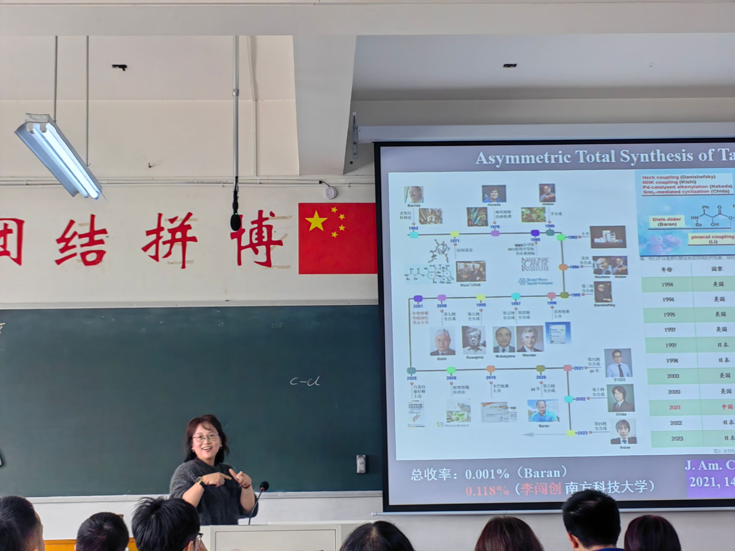 张丽军副教授用深入浅出的讲解、生动形象的描述、清晰严密的逻辑向在座的老师和学生们做了“醇、酚、醚”章节的教学示范。张老师首先回顾了上节课的教学内容,引出含氧官能团的化合物,进而导出本次课程的内容。在教学过程中,以抗癌药紫杉醇的发现与全合成的发展脉络为例,向老师同学们介绍了含氧化合物的重要性。特别是通过对历史事件的介绍,让同学们了解了国家自然资源保护的重要性。通过列举我国优秀青年科学家李闯创教授在紫杉醇全合成方面的杰出贡献的案例,深深感染了课堂老师学生们,激发了同学们努力学习自然科学知识、为祖国科学事业作贡献的斗志。随后,张老师深入浅出的对醇酚等化合物的结构以及物理化学性质进行了详细的讲解。讲解过程条理清晰,层层推进,破解难点。不断设问,引导学习,课堂氛围活跃,学生紧跟教师思路,感受有机化学的魅力。