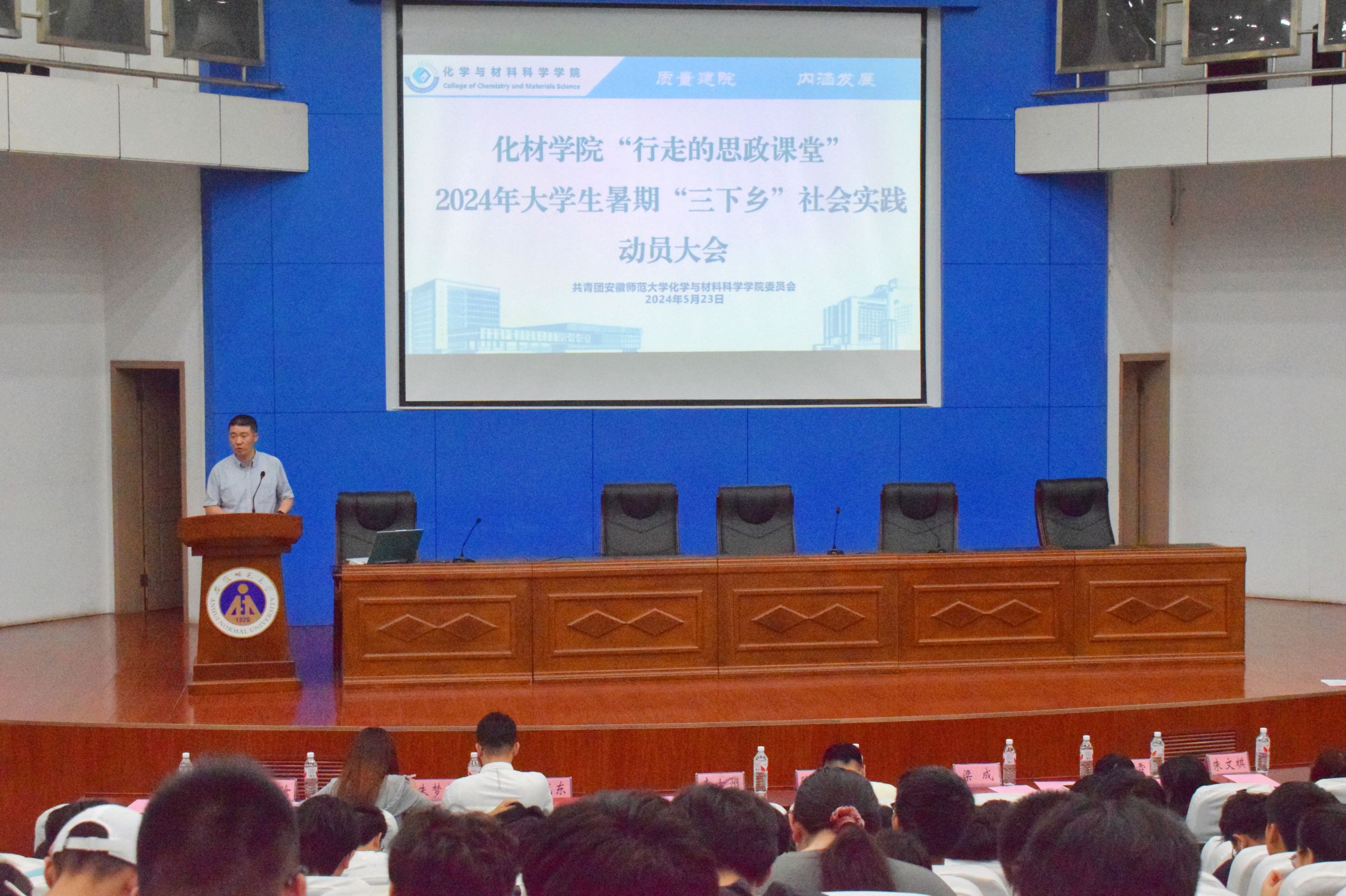 在敬文图书馆报告厅厅举行2024年暑期“三下乡”社会实践动员会暨专题培训会。学院党委副书记李古州、团委书记梅冠东、团委副书记陶勇、2022级辅导员、2023级辅导员、2022级工科专业及化学非师范专业全体学生、2023级学生代表出席本次会议。本次会议由2023级化学师范专业周明月主持。