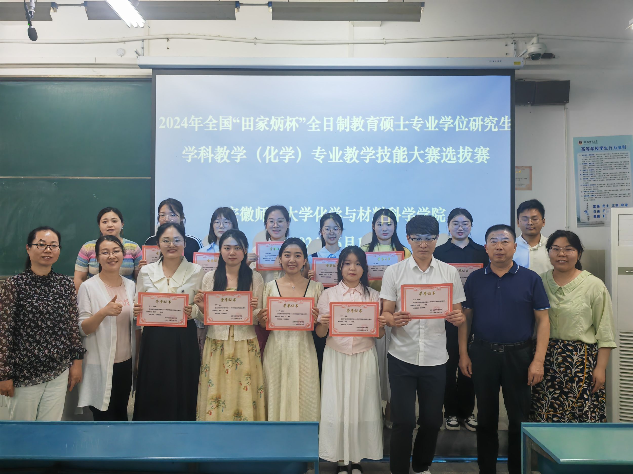 本次选拔赛邀请了校外专家芜湖市教研所研究员严增进老师、芜湖一中夏婷婷老师、安徽师范大学附属中学孙永兴老师以及化学教育研究所孙影、阙荣辉、程瑶琴、周冬冬老师担任评委,由孙影老师主持,全体学科教学(化学)专业研究生观摩了此次比赛。评委老师参考文件中相应评分标准进行评选,最终评出一等奖5名,二等奖6名。其中一等奖将代表我校参加2024 年全国“田家炳杯”全日制教育硕士专业学位研究生学科教学(化学)专业教学技能大赛。