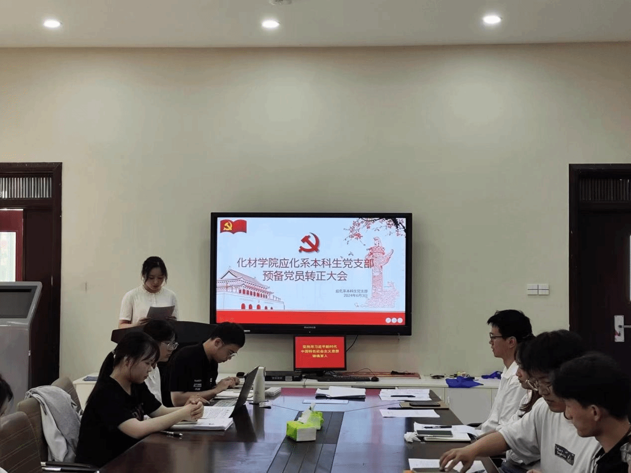 大会第二阶段,应化系本科生党支部在礼勤楼201会议室召开党支部大会,大会讨论接受丁刘灿等5名同志转为中共预备党员,及预备期满的许彩凤等6名同志如期转正的相关事宜,大会由支部书记梁成主持。丁刘灿等5名发展对象依次向党支部进行汇报,表明自己的入党动机和加入中国共产党的强烈愿望。随后,支部书记梁成代表支委会汇报了5位同志的审查情况,梁成、朱文棋作为培养联系人介绍了培养考察意见,与会党员充分讨论并发表了意见。通过讨论,大会认为丁刘灿等5名同志基本符合党员条件,经与会正式党员投票表决,一致同意接收丁刘灿等5名同志成为中共预备党员,拟提交学院党委审核。