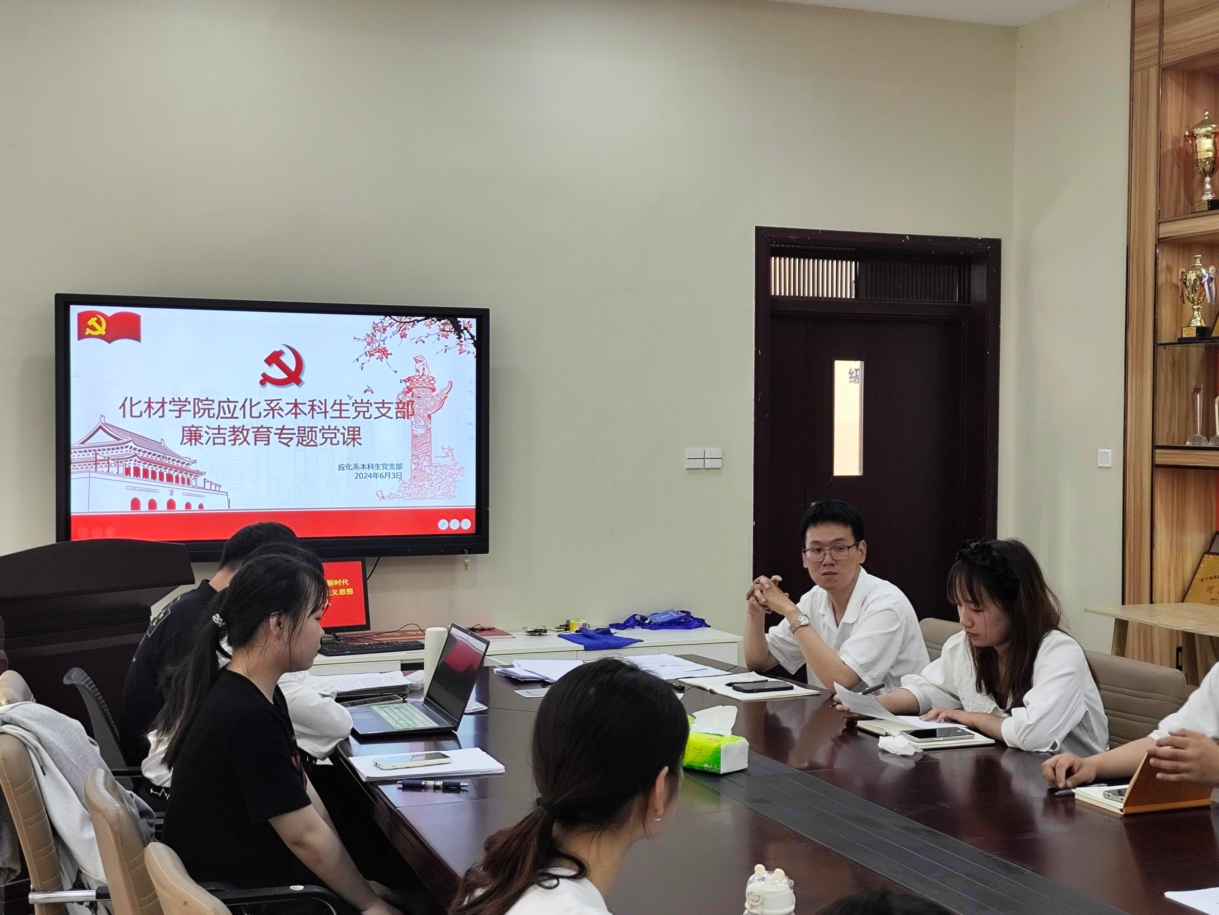 龚娟)2024年6月3日下午,应化系本科生第二党支部于礼勤楼707、201会议室召开2024届毕业生党员教育专题组织生活会及党员发展支部大会,学院党委副书记李古州列席指导,会议由支部书记梁成主持。