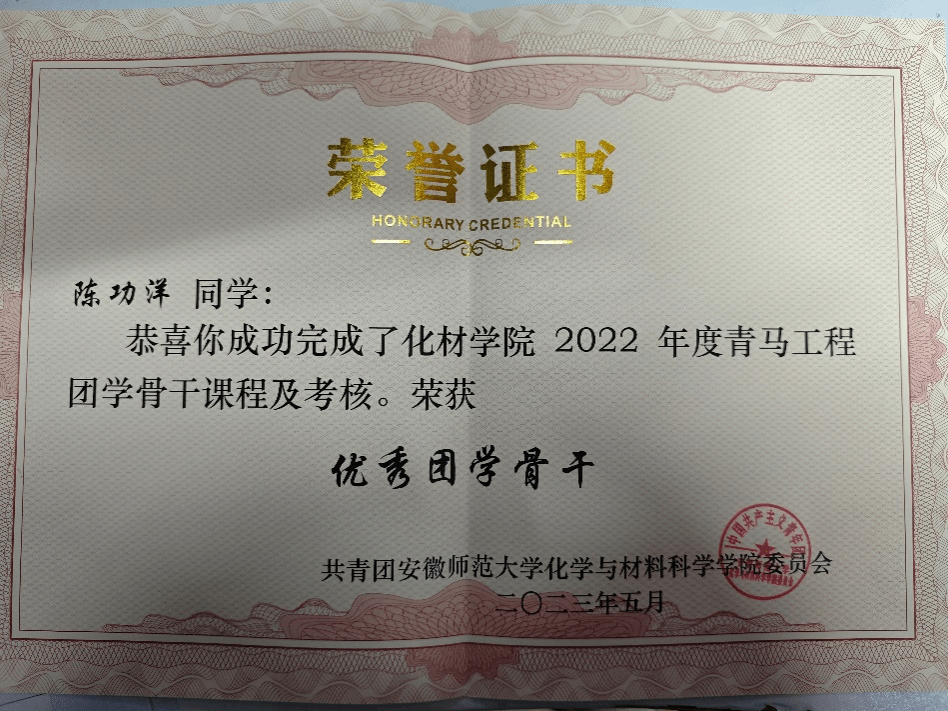 他是中国共产党坚定的追随者,大学四年一直以实际行动积极地向党组织靠拢。除积极完成“青年大学习”主题团课以外,他还认真上好每一节党课,做好课堂笔记,用一字一句记录着他接受党组织培训期间的阶段性变化,以优异的成绩通过的党组织的考核,成功地加入了中国共产党,成为了一名光荣的预备党员。此外,他还积极参加学院“青马工程”团学骨干培训班,主动寻求思想上的进步,并在培训班结业考核中,荣获“优秀团学骨干”称号。