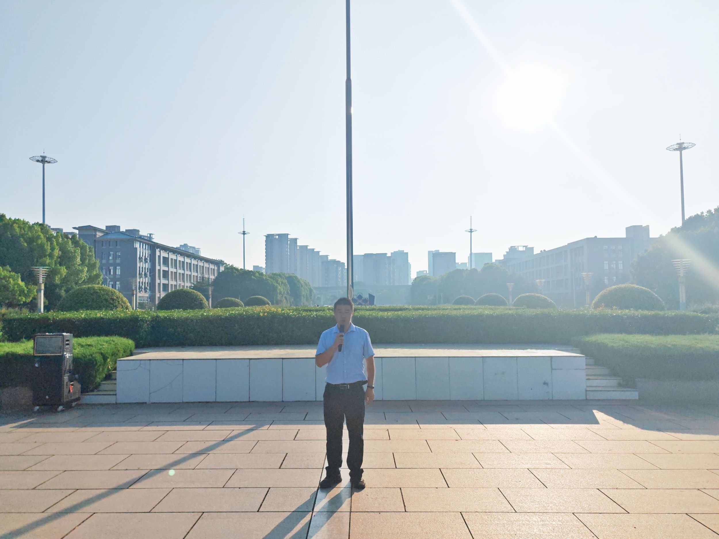 早上7时,国旗护卫队队员迈着刚劲有力的步伐,护旗入场,伴随着激昂的国歌声,五星红旗冉冉升起,全体师生庄严肃立,行注目礼,齐唱国歌。