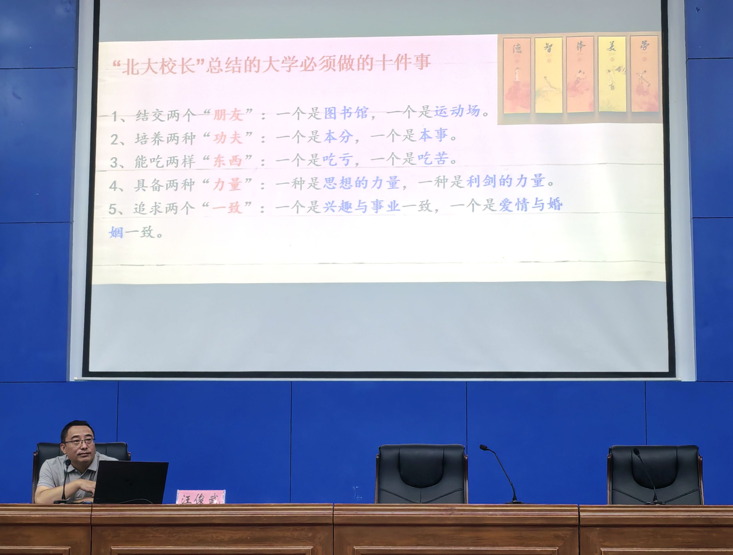 在新生入学教育阶段,汪俊武围绕“为什么上大学”“上大学可以做什么”两个问题与同学们一起探讨大学每个阶段的主要任务,希望同学们尽快完成角色转变,养成良好的行为习惯,做好个人成长和发展规划。同时,他对新生提出多方面建议,引导新生要提升适应能力、自主学习能力和心理健康素质,勉励学生发挥主体作用,管好时间、管好自己,不断提升个人的知识、能力和素养,努力走实、走稳、走好人生的每一步路。他教育全体同学要明确未来目标和发展方向,努力成为有理想、敢担当、能吃苦、肯奋斗的新时代好青年。