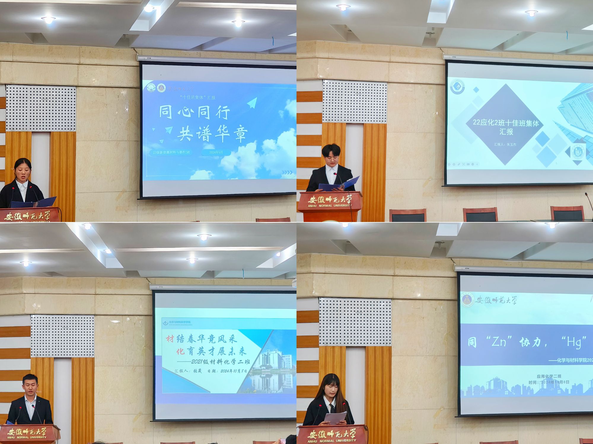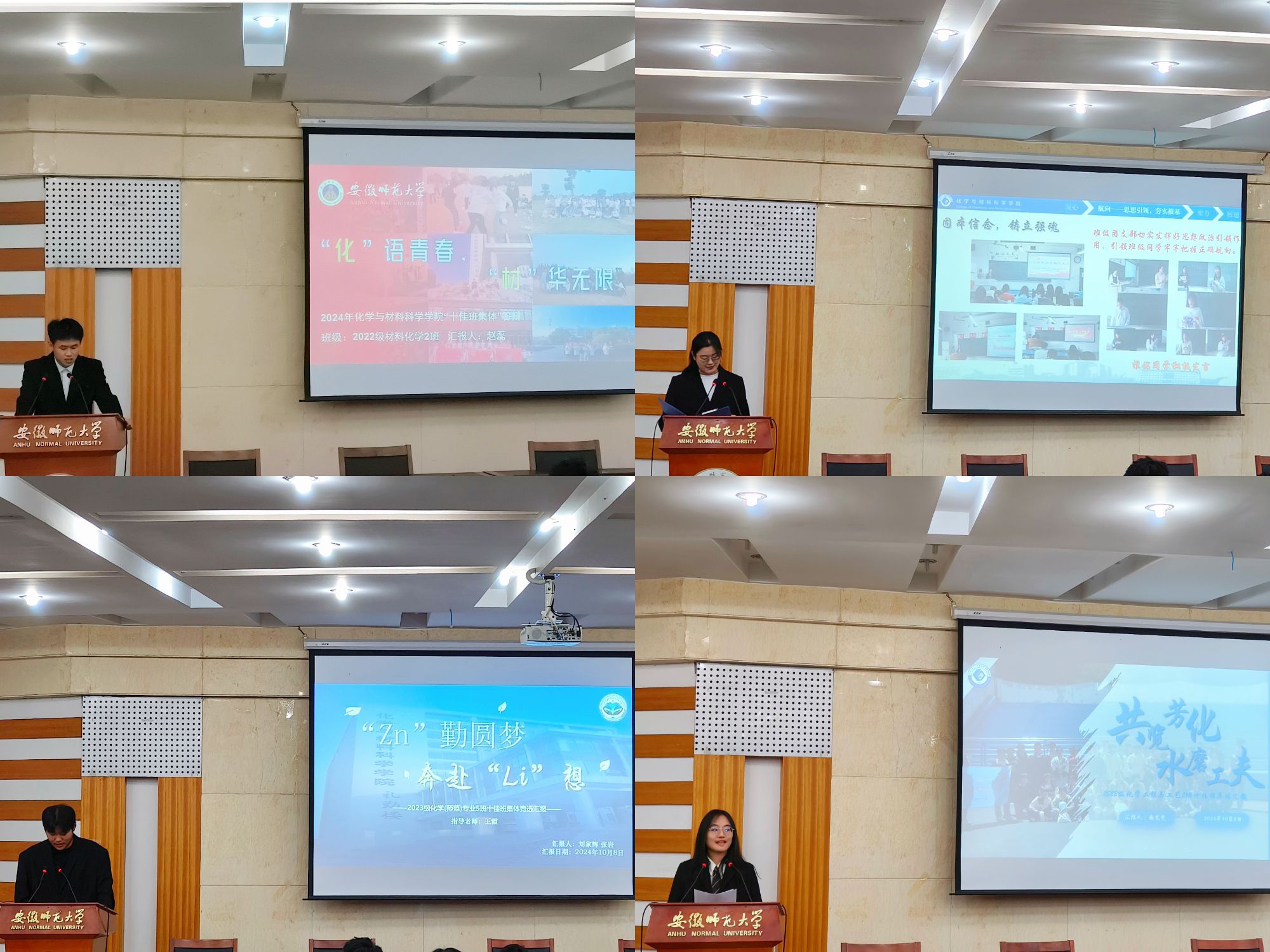 本次学院“十佳班集体”评选共有19个班集体参加现场汇报。各班代表依次上台汇报,他们生动地向评委老师及同学们展现班级的卓越风采。“材结春华竞风采,化育英才展未来”21级材料化学2班的同学们在学科竞赛方面全面开花、在志愿服务方面躬身奉献,努力为社会贡献一份力量;“化风为师韵,Cu Zn共筑梦”22级化师2班的班级代表用具体的数字展示了班级独特的风采,高课程通过率、高竞赛获奖率是班级优良学风的展现,更是同学们对自我要求的完美诠释;“Zn勤圆梦,奔赴Li想”23级化师5班的汇报人表达班级成员团结拼搏,勇敢逐梦,昂扬向上的学习态度和人生姿态。各班级的演讲十分精彩,每一段文字、每一张图片,都是化材人良好班风建设的体现。