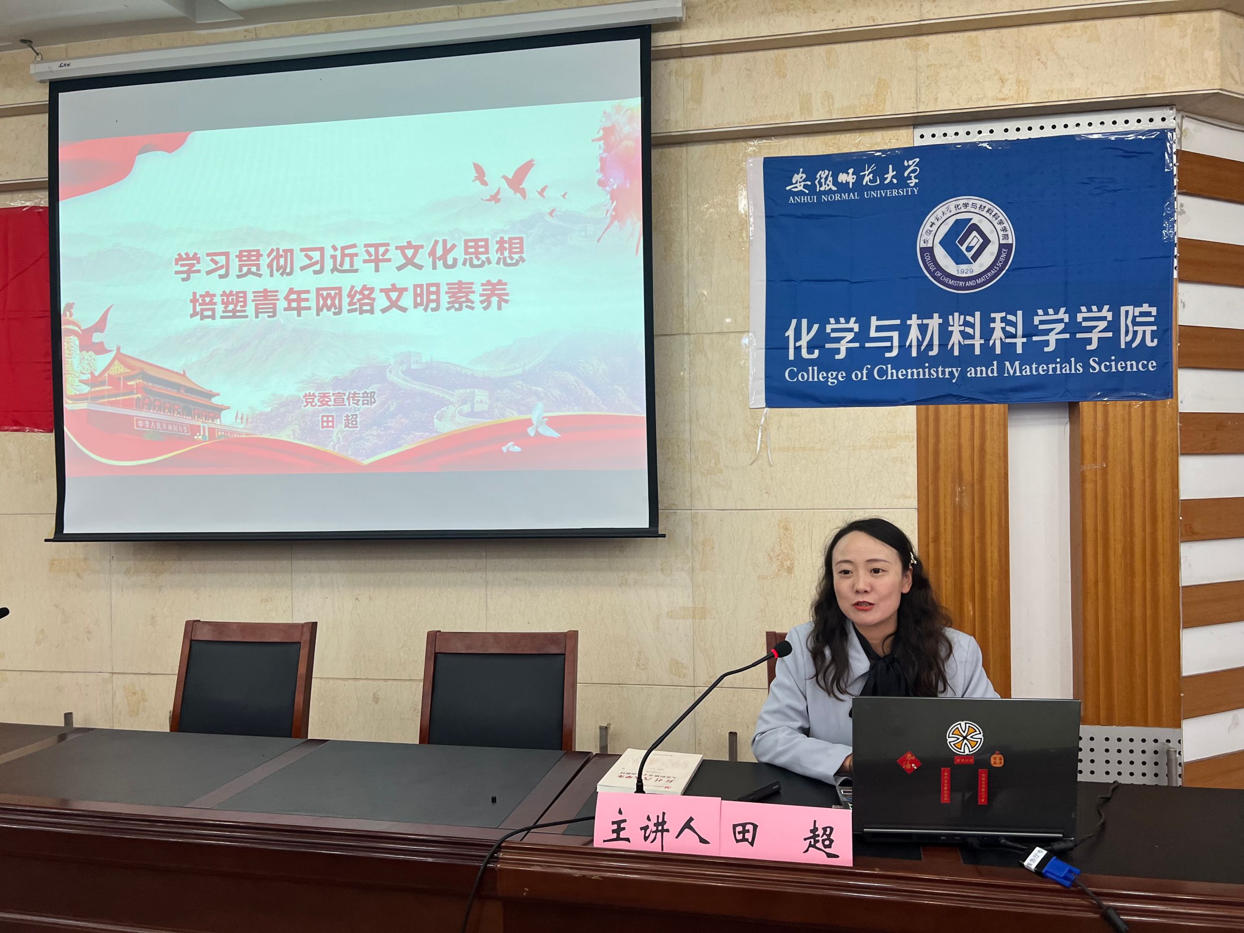 党委宣传部副部长田超以《学习贯彻习近平文化思想,培塑青年网络文明素养》为主题,从习近平文化思想的形成过程、深刻认识习近平文化思想的重大意义、网络不文明行为浅析、新时代大学生善于“用网”四个方面进行深刻阐述。她指出,作为新时代的青年,要肩负起时代赋予的使命,在网络世界中展现出良好的精神风貌和道德品质,为营造清朗的网络空间贡献自己的力量。