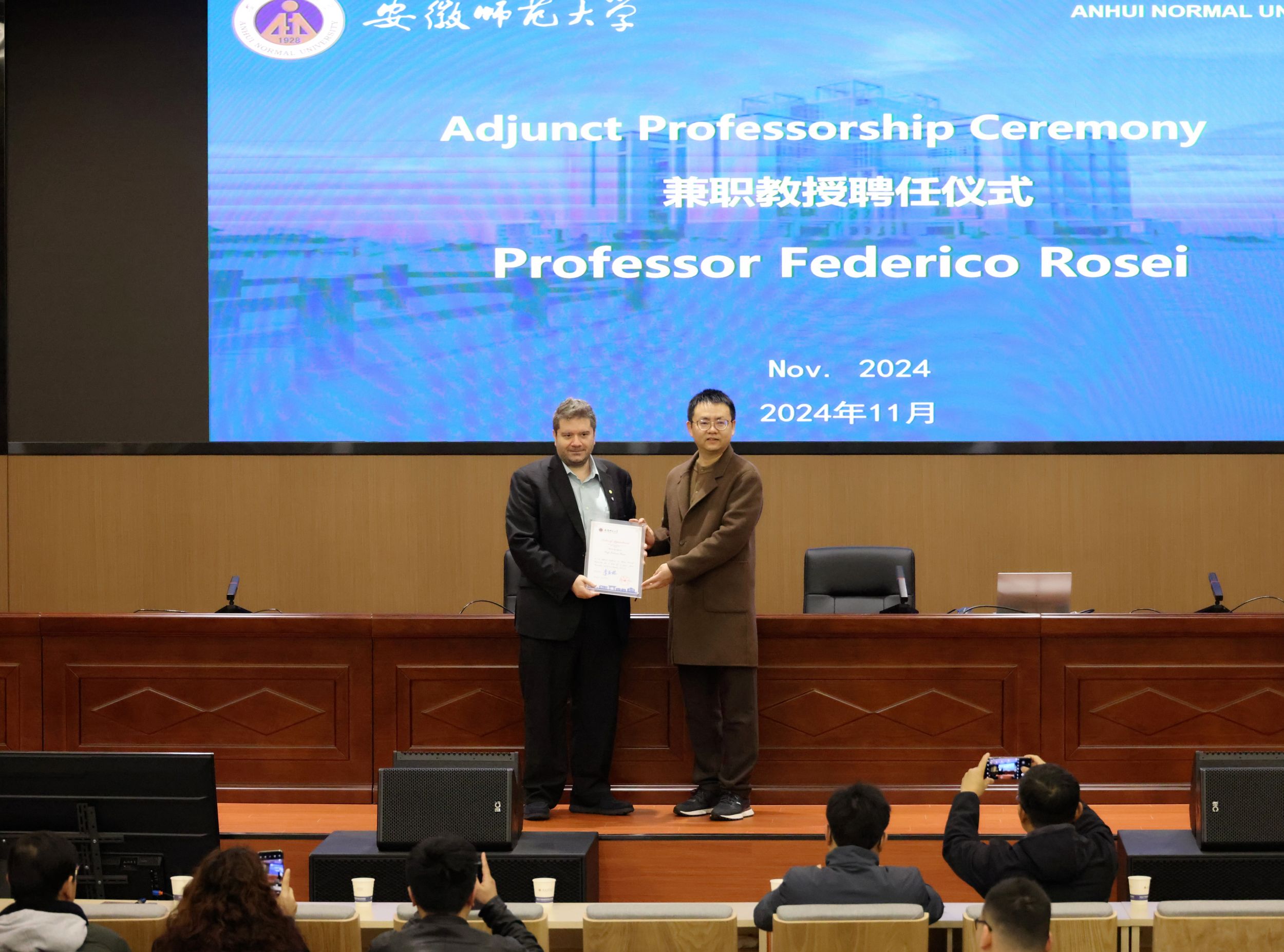 2024年11月20-22日,意大利的里雅斯特大学Federico Rosei院士访问我校,并举行系列学术活动。11月21日,Federico Rosei院士受聘我校兼职教授仪式暨学术报告会在文典楼西侧裙楼三楼视频会议室举行。校党委副书记、常务副校长熊宇杰教授主持学术报告会,并向Federico Rosei院士颁发兼职教授证书。校人事处、国际交流合作处、卡通色情