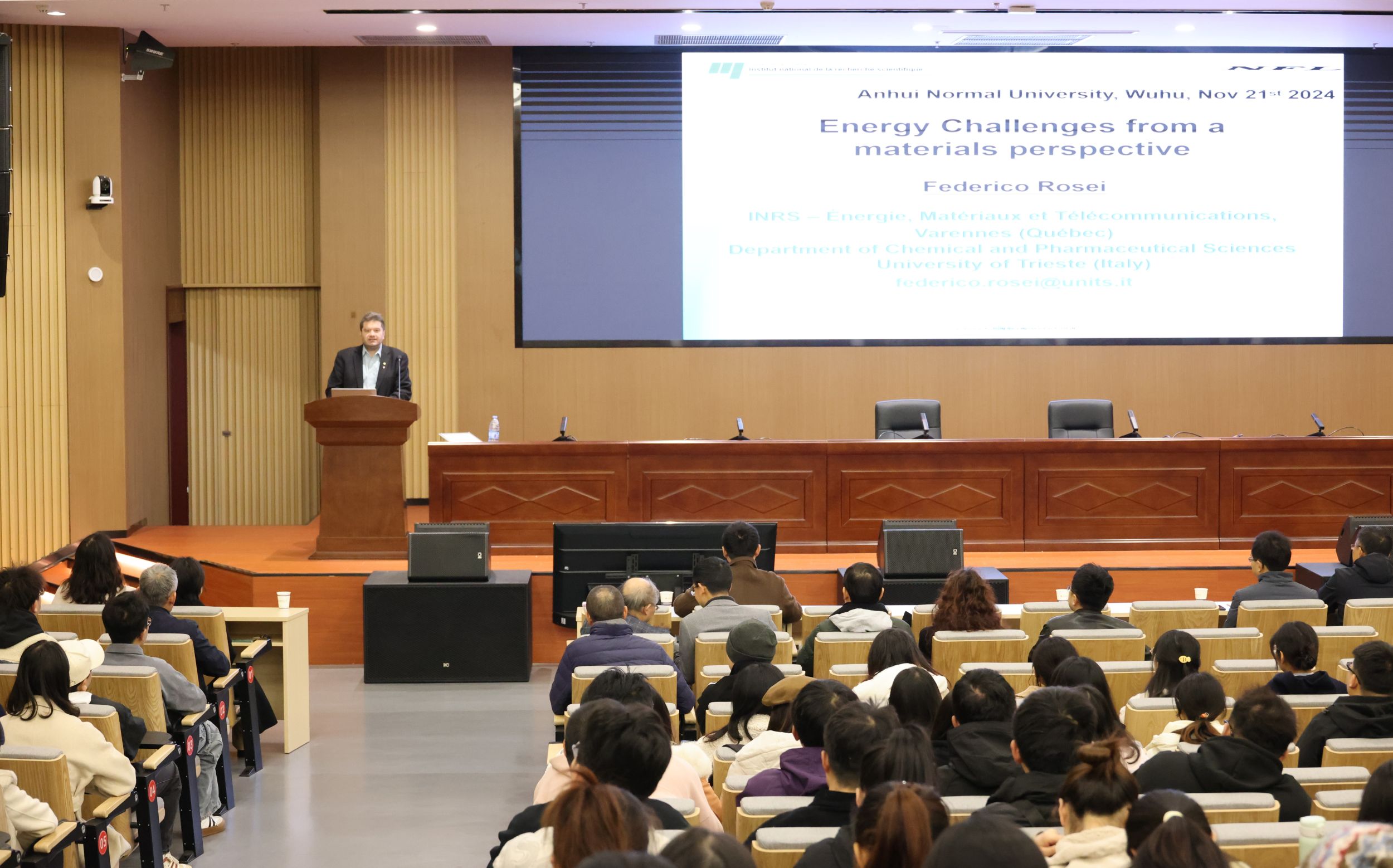 Federico Rosei院士首先从人类目前和将来面临的能源挑战出发,阐述寻找经济适用的清洁能源的必要性,介绍课题组在能量转换材料、太阳能技术材料、光电化学太阳电池、量子点敏化太阳能电池等清洁能源技术领域取得的标志性成果。其次,Federico Rosei院士从氢能的挑战、金属氧化物材料等多个方面对能源技术进行了分析。最后,Federico Rosei院士对纳米材料的合成设计、可再生能源技术以及第三代太阳能技术进行了总结和展望。报告会期间,Federico Rosei院士与参会师生展开了一系列学术讨论,并回答了与会师生提出的问题。