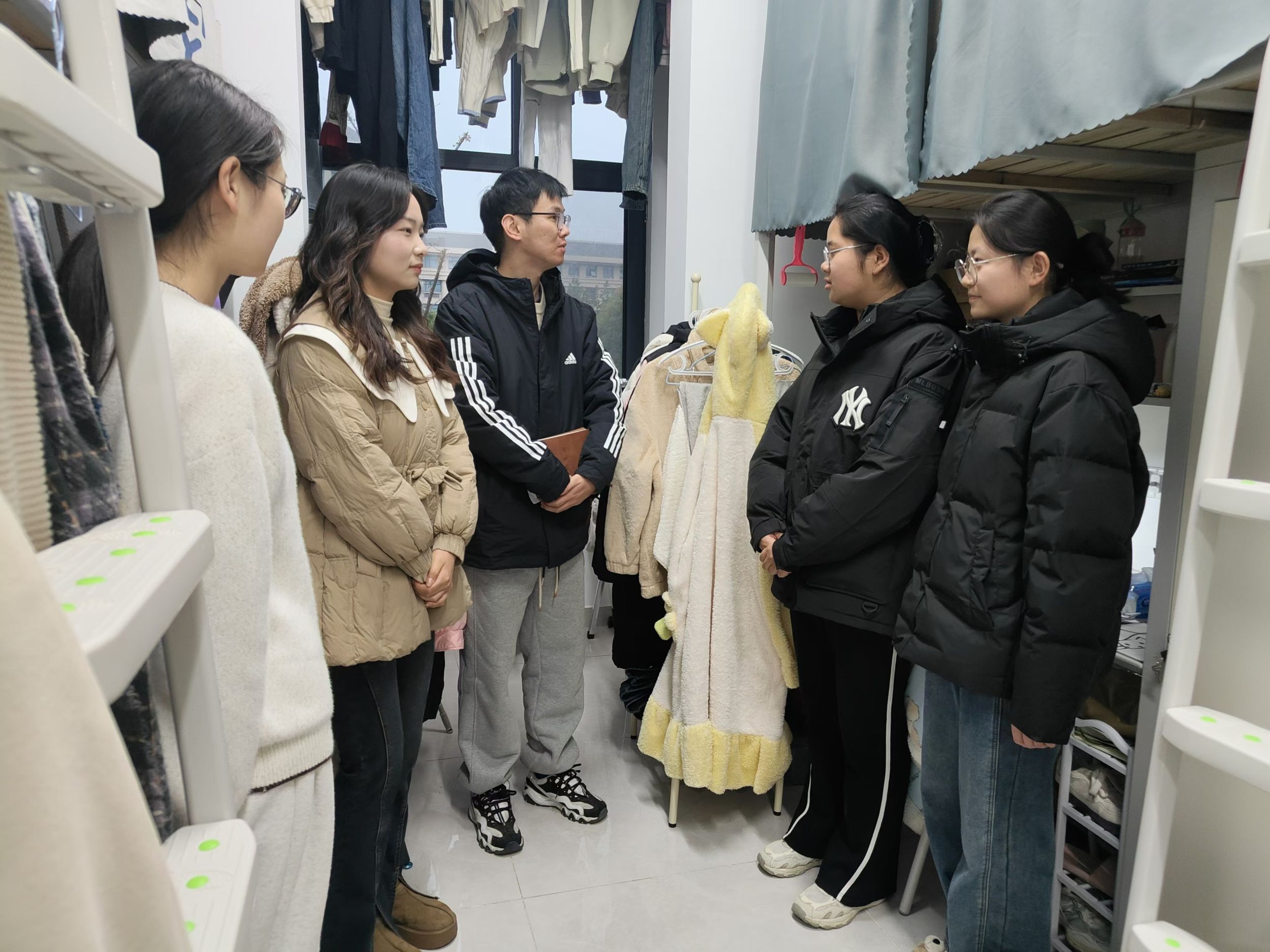 随后,辅导员们走访了学院59栋学生寝室。在走访过程中,他们认真倾听同学们的心声,了解大家在学习、生活、情感等方面遇到的问题和困惑。期末考试临近,针对同学们提出的各种问题,辅导员们耐心细致地给予解答和指导,帮助他们理清思路,找到解决问题的方法。除了答疑解惑,辅导员们还深入了解了学生的生活状况,询问同学们的作息习惯、饮食起居等细节,关注大家的身体健康和心理健康。
