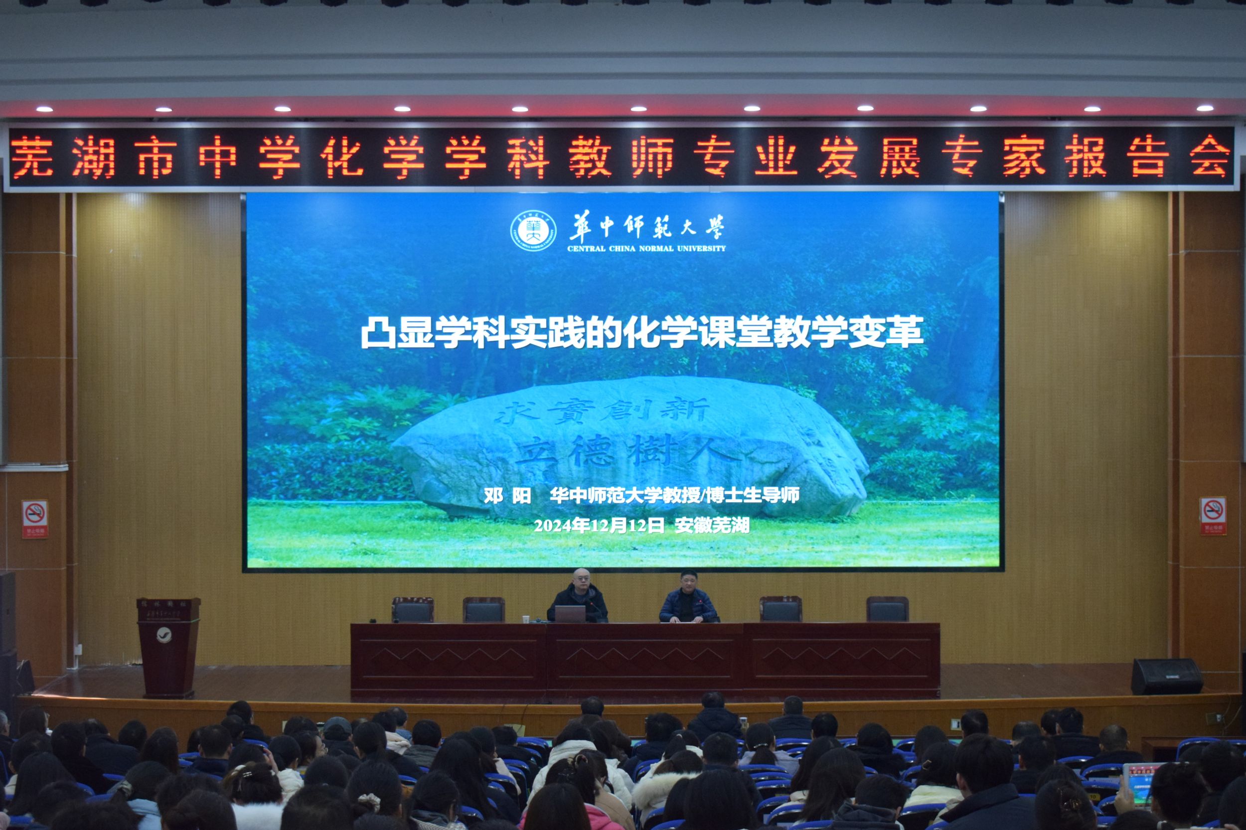 芜湖市第十二中学的会议室内座无虚席,邓阳教授的讲座围绕如何在日常教学中强化学科实践,使学生能够通过亲身实践更好地掌握化学知识,从而激发学生们的学习兴趣和科学探究能力。邓教授首先指出,传统的化学教学过于注重理论知识的灌输,而忽视了实验操作和实践探索的重要性。他强调,教师应该设计更多富有挑战性和实用性的实验,让学生在动手操作的过程中学会观察、分析并提出假设,通过实验验证假设,培养学生的证据推理能力和解决问题的方法。邓教授还分享了一些成功的教学案例,强调要培养学生的科学思维和方法。