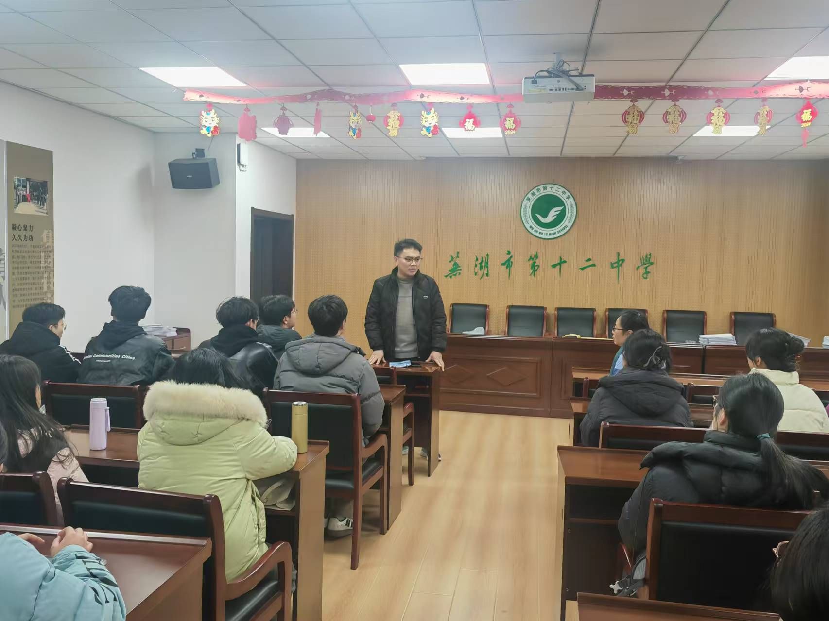 随后,师生们齐聚会议室,李明老师简要地向大家介绍了芜湖十二中的历史发展脉络,讲述了学校在岁月长河中的变迁与成长,以及在教育教学领域取得的一系列成就和荣誉。同时,李老师还介绍了学校当前的学生构成情况,包括生源特点、学生兴趣爱好以及不同年级学习特点等,让同学们对这所学校的整体情况有了全面而深入的了解,为他们在今后的教育实践中更好地因材施教提供了重要的背景信息和参考依据。