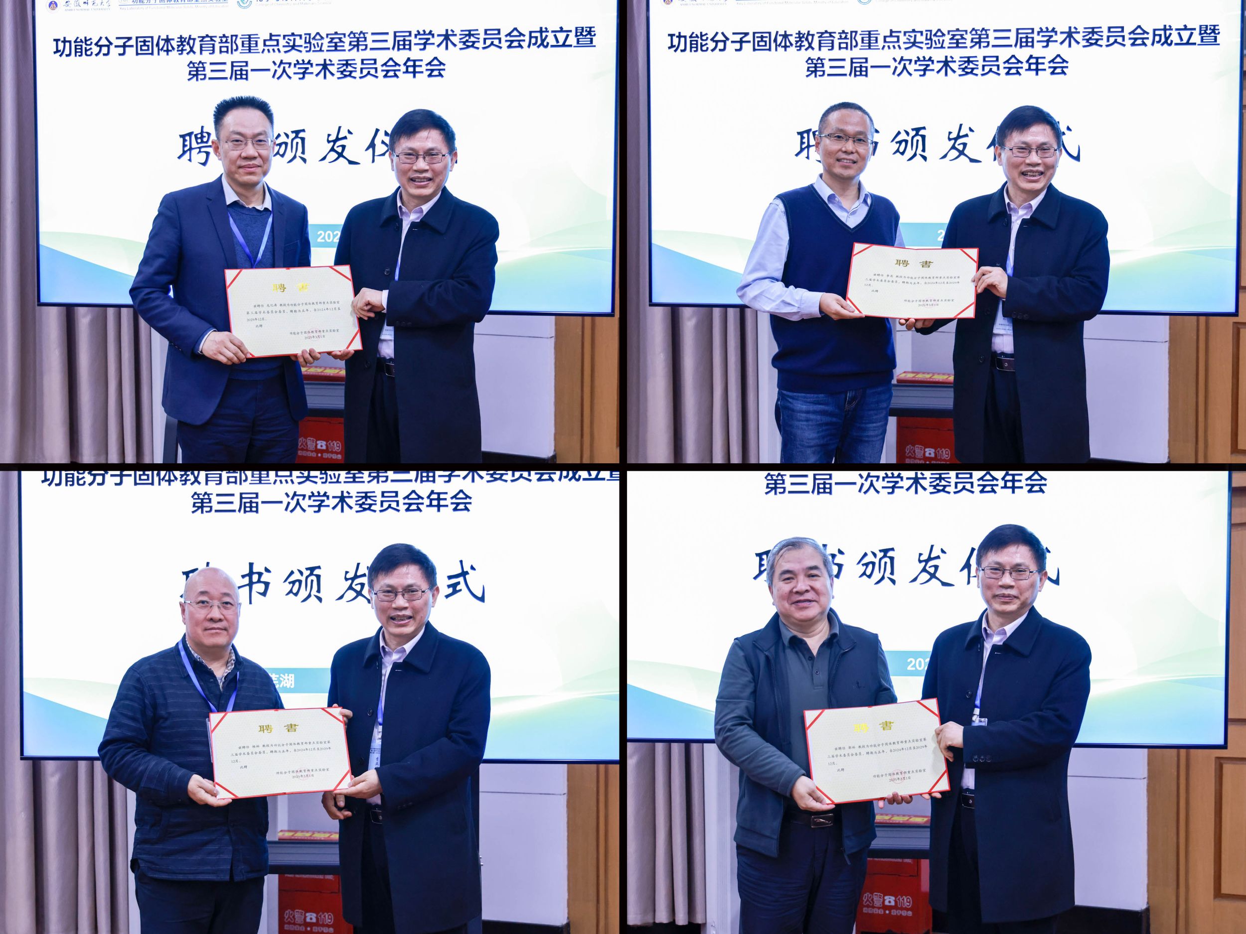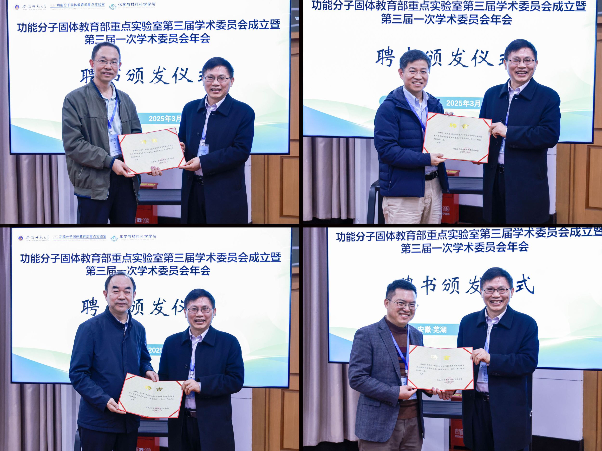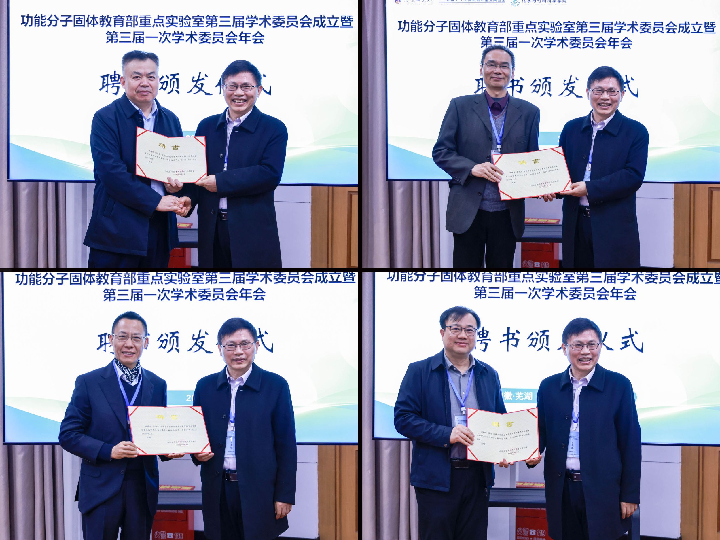 开幕式由熊宇杰主持。李亚栋代表学校致辞,对各位领导、专家的到来表示热烈欢迎,感谢各位专家长期以来对安徽师范大学建设发展,尤其是对功能分子固体教育部重点实验室、化学学科、材料学科建设发展的关心、支持与指导,并为功能分子固体教育部重点实验室第三届学术委员会各位委员颁发聘书。