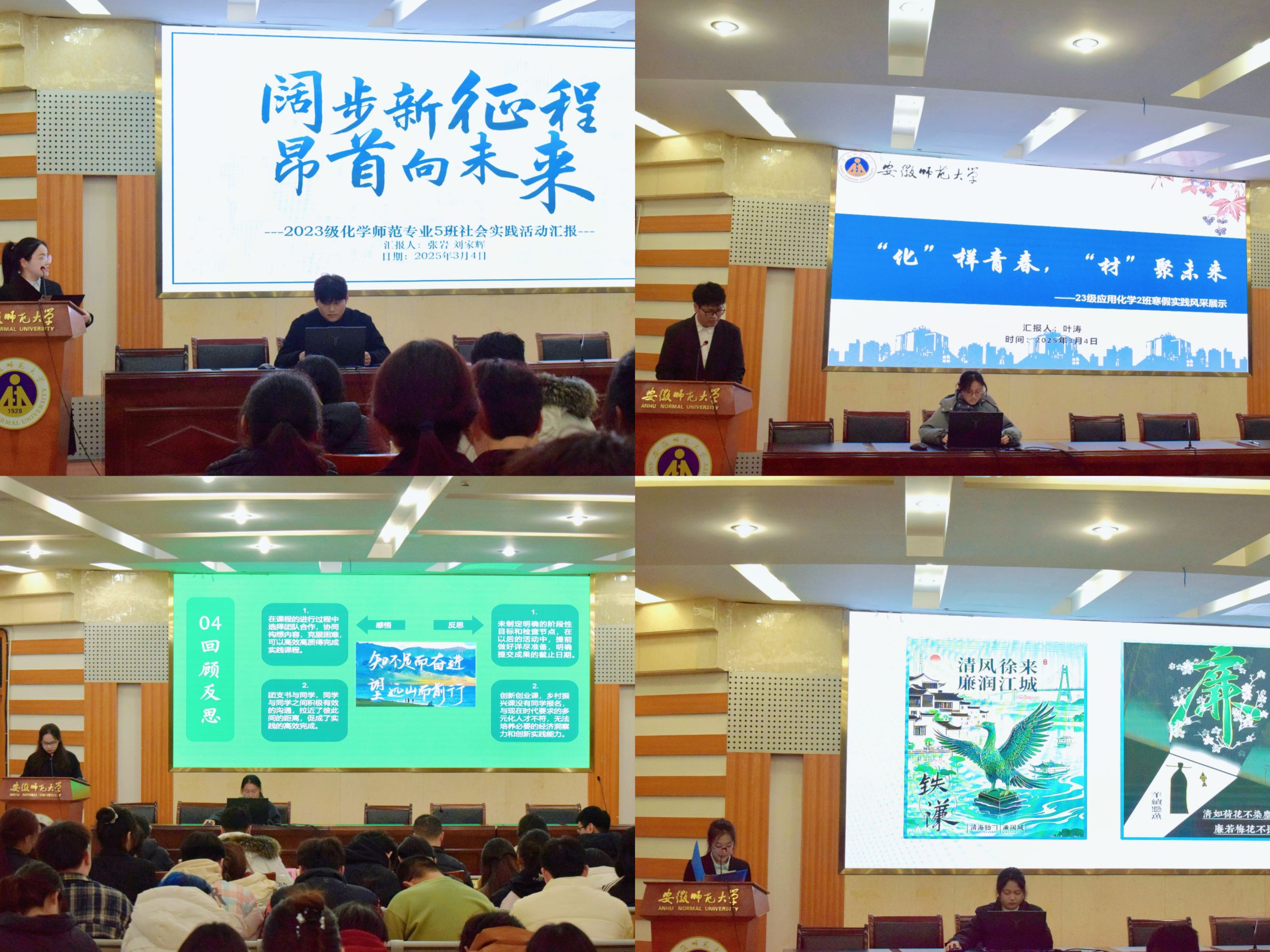 学院团委组织委员刘君蕊对本次寒假社会实践活动的开展情况进行汇报,本次活动学院2023级、2024级本科生全员参与,在八个课题方向共形成调研报告270余份,实践报告130余篇,文化纪录片12部,文创作品50余件,并通过线上线下宣传覆盖受众2000余人,累计服务时长超4000小时,惠及群众3000余人次。全方位展现了化材学子知行合一、服务社会的青春风貌。