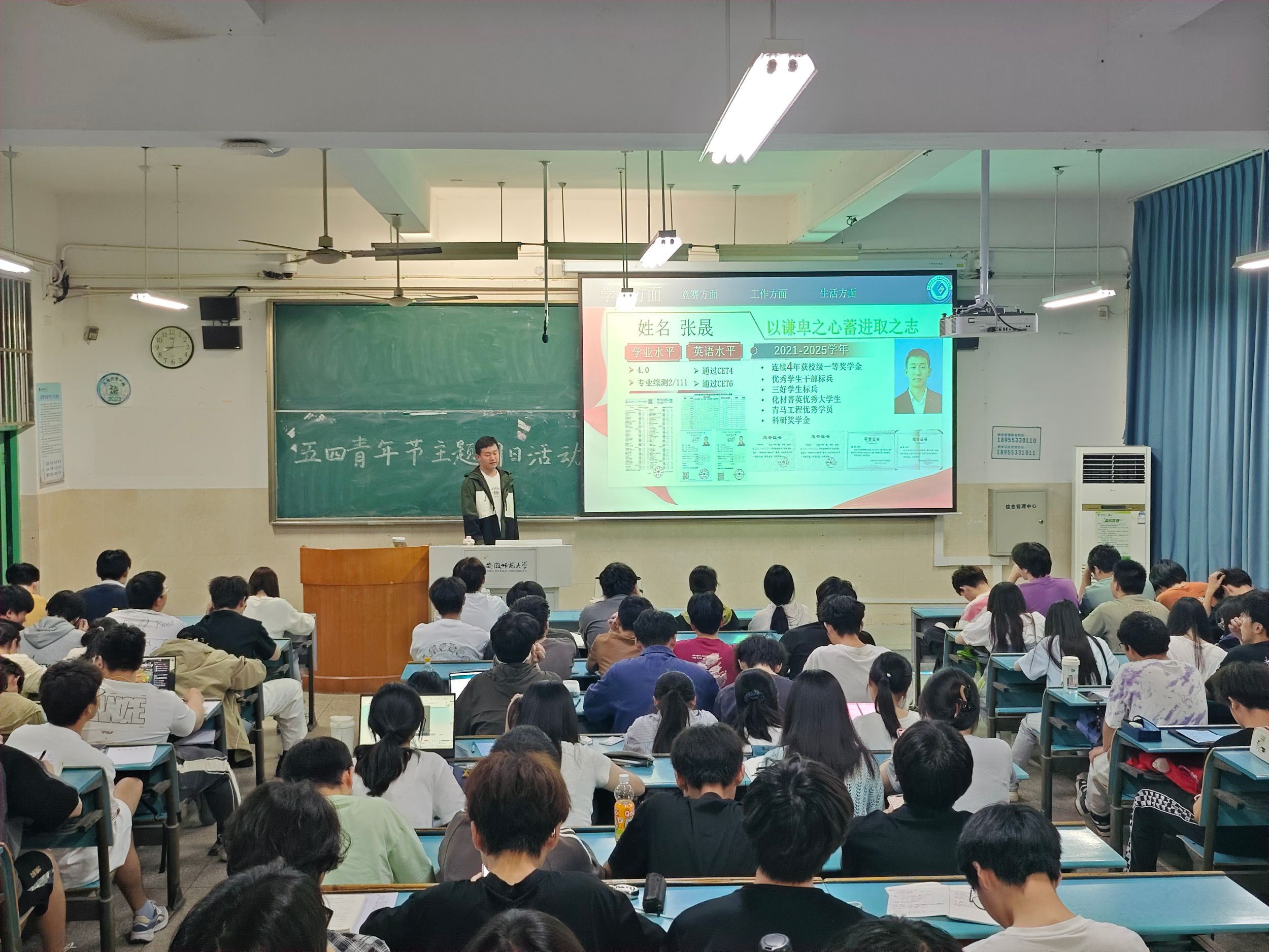 于4月28日-4月29日组织2024级和2023级学生以班级为单位开展五四青年主题团日活动,并邀请2021级应用化学专业张晟和2021级化学师范专业陈子祥进行活动宣讲。