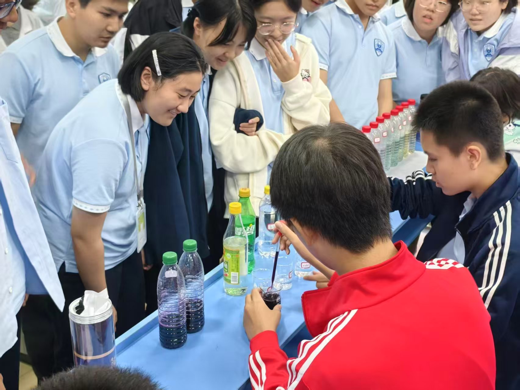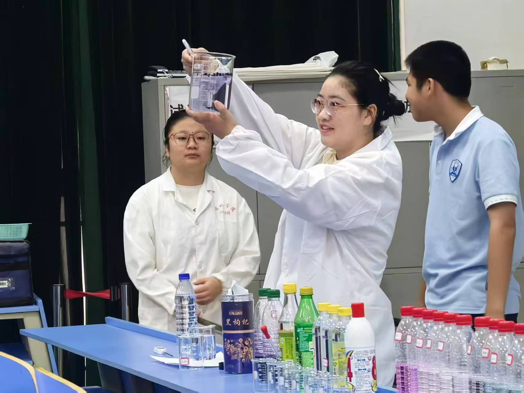 如果说黑枸杞实验是“生活中的化学”,那么“碘钟振荡实验”则展现了化学反应的“精密与神奇”。志愿者先向学生们讲解实验原理:在Mn²⁺催化下,过氧化氢既作氧化剂又作还原剂,与碘酸钾、单质碘发生振荡反应,使溶液呈现“无色→琥珀色→蓝色”的循环变化,宛如一座“看不见指针的化学时钟”。