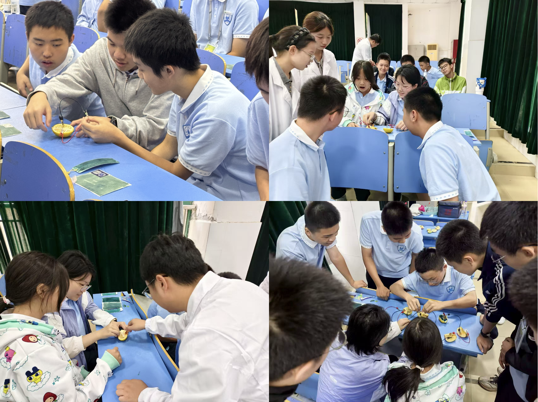 在“水果电池”小组,柠檬、苹果、梨子成为“主角”。学生们选取自己喜欢的水果,将分发的电极片平行插入果肉内(间距1-2厘米),用带鳄鱼夹的导线连接,制成单个水果电池,连接LED灯观察灯泡是否发光。随着多个水果电池的不断串联,LED开始发光并越来越明亮!活动结束时,学生们纷纷与自己的“水果电池组”留下合影,活动利用生活中的化学原理点亮学子们的科学探究梦。