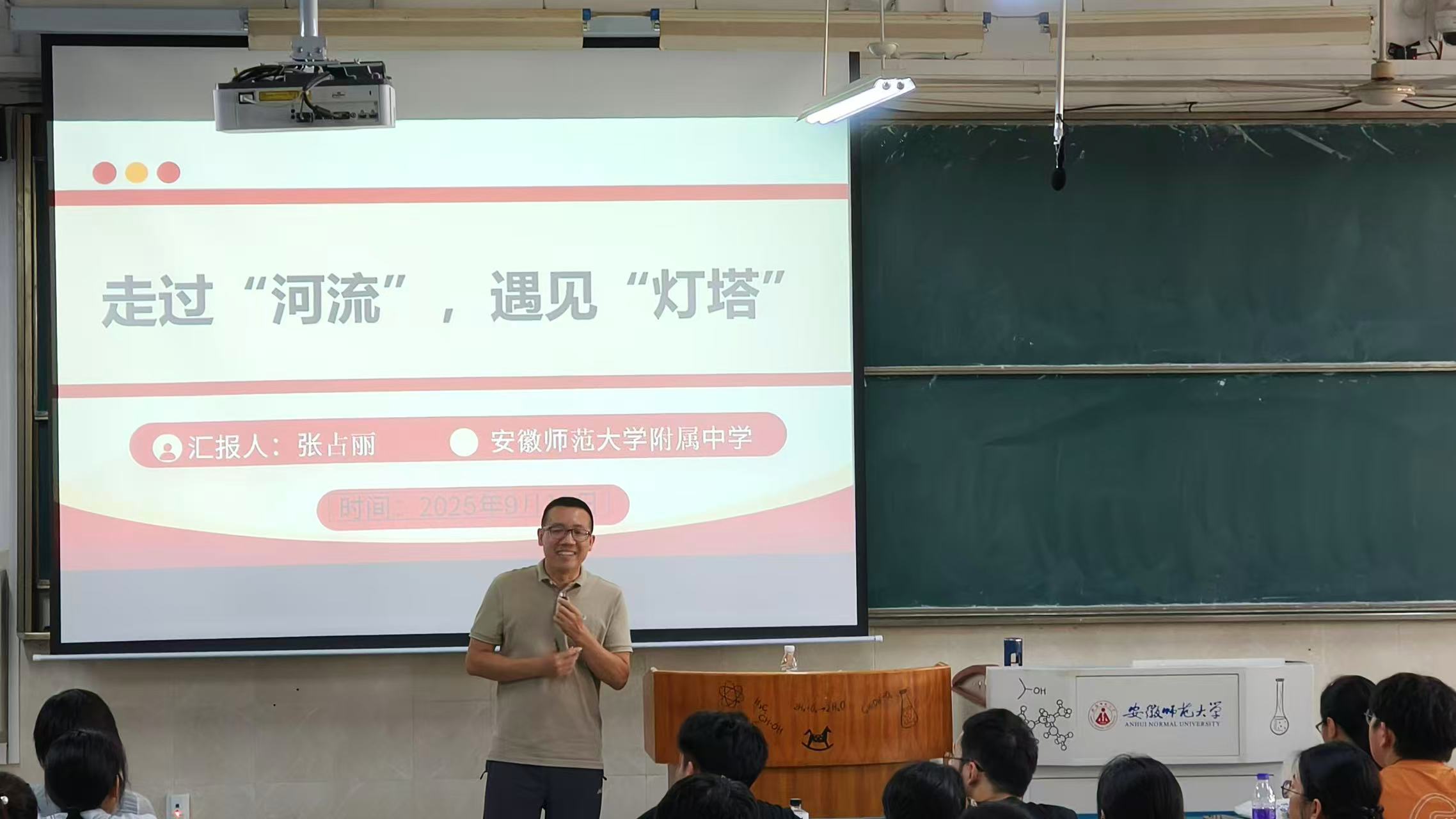 9 月 16 日下午,安徽师范大学附属中学张占丽老师在行知楼 2010502 教室,以 “走过‘河流’,遇见‘灯塔’—— 班级管理漫谈” 为题开讲。张老师以 “班主任是学生成长路上的‘灯塔’” 为核心,结合大量真实班级管理案例,生动诠释了班主任工作的价值与挑战。他指出,教育心理学是班级管理的 “理论基石”,班主任需精准 “看见” 不同层次学生的需求 —— 既要关注成绩优异生的进阶诉求、中等生的突破渴望,也要重视后进生的转变期待,结合学生家庭背景与学习基础,秉持 “接受不可改变的,改变可以改变的” 理念开展个性化管理。针对 “如何激发学生内驱力” 这一关键问题,张老师深入剖析学生行为背后的动机,分享可落地的激励路径;最后还围绕班级文化建设提出建议,强调良好的班级精神能潜移默化凝聚向心力,助力学生全面发展。整场报告既有理论高度,又有实践温度,让师范生深刻认识到班级管理在教育工作中的重要性,为未来成为 “懂管理、会育人” 的化学教师提供了可借鉴的实践范式。