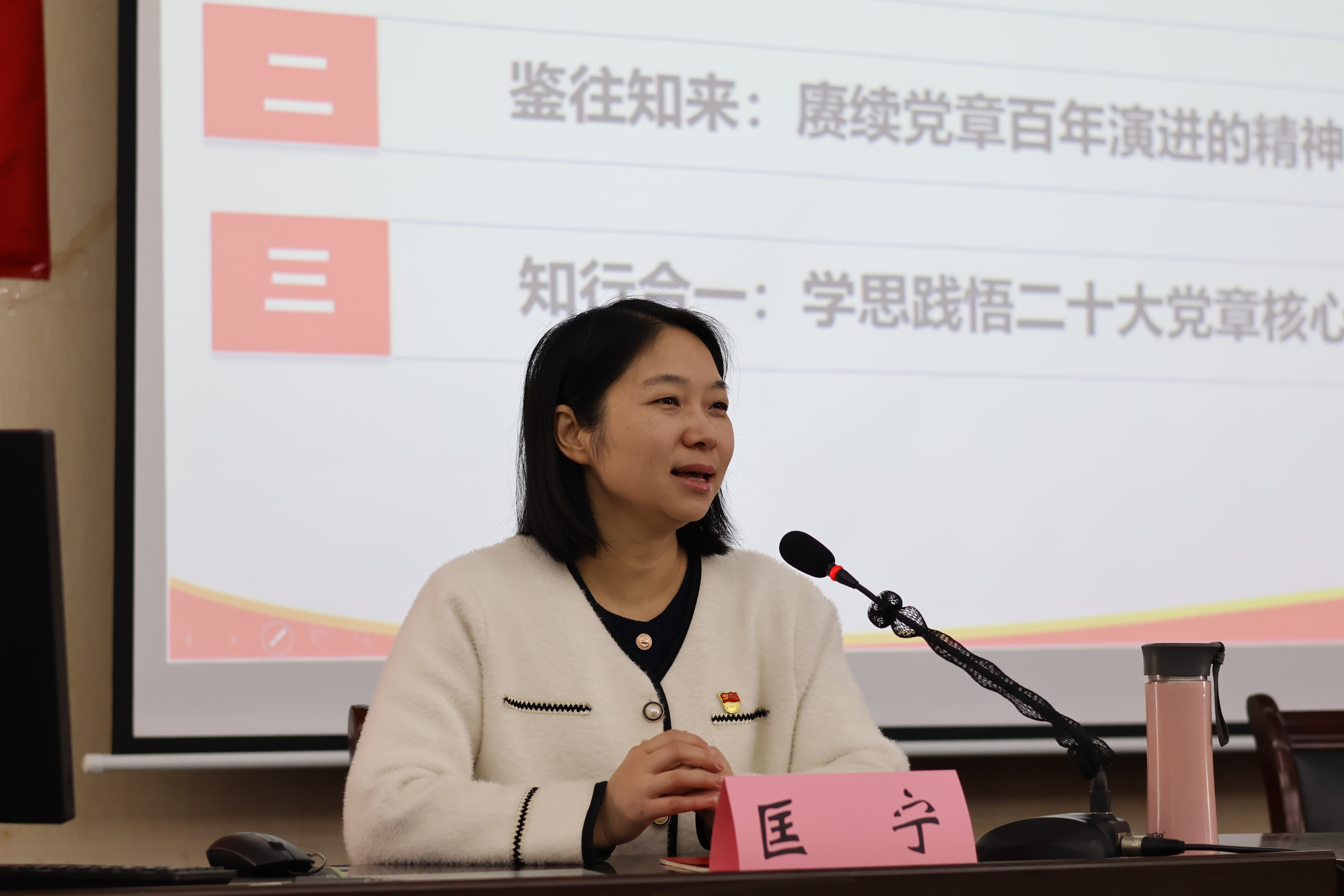 马克思主义学院副教授匡宁教授以《学深悟透新党章,踔厉奋发新征程》为题,从党章的根本地位、百年发展历程、二十大党章核心要义三个维度,对《中国共产党章程》进行全面系统解读。她重点阐释了二十大党章修改的背景、主要内容与重大意义,深入剖析党章所蕴含的信仰力量与实践要求,引导全体学员把学习党章作为必修课,自觉以党章为根本遵循规范言行,坚定理想信念,争做政治合格、纪律合格、品德合格、发挥作用合格的学生党员。