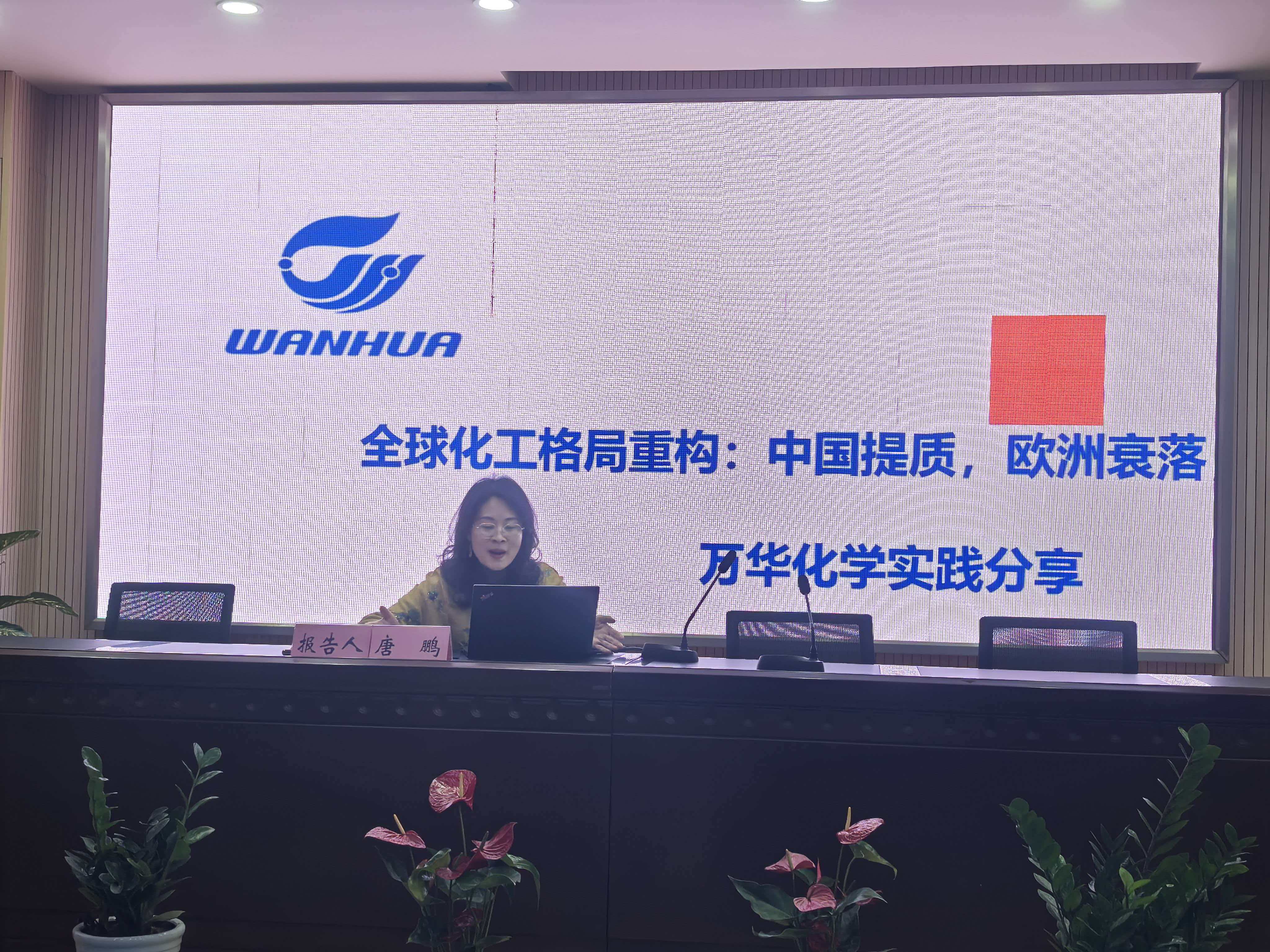 随后,在学苑楼6号楼216报告厅,万华化学集团采购中心副总经理唐鹏作了题为“全球化工格局重构:中国提质,欧洲衰落,中东崛起——万华化学实践分享”的专题报告。报告会吸引了100余名师生参与,现场气氛热烈。唐鹏以详实数据与丰富案例,系统阐述了当前全球化工产业的结构性变迁与区域发展态势。她指出,欧洲化工装置老化、地缘冲突等因素加速了当地产能收缩,预计到2027年将有460万吨/年的乙烯产能、228万吨/年的丙烯产能和43万吨/年的丁二烯产能永久退出市场;中东依托资源与成本优势,持续扩大市场份额;中国化工行业则在规模效应、技术升级与绿色转型中稳步发展,全球占比显著提升,但在精细化工等领域仍面临挑战。结合万华化学在技术创新、成本控制与全球布局等方面的实践经验,唐鹏进一步剖析了中国化工企业的突围路径与发展逻辑。报告为师生提供了理解全球化工格局的宏观视野,揭示了中国化工的崛起模式。
