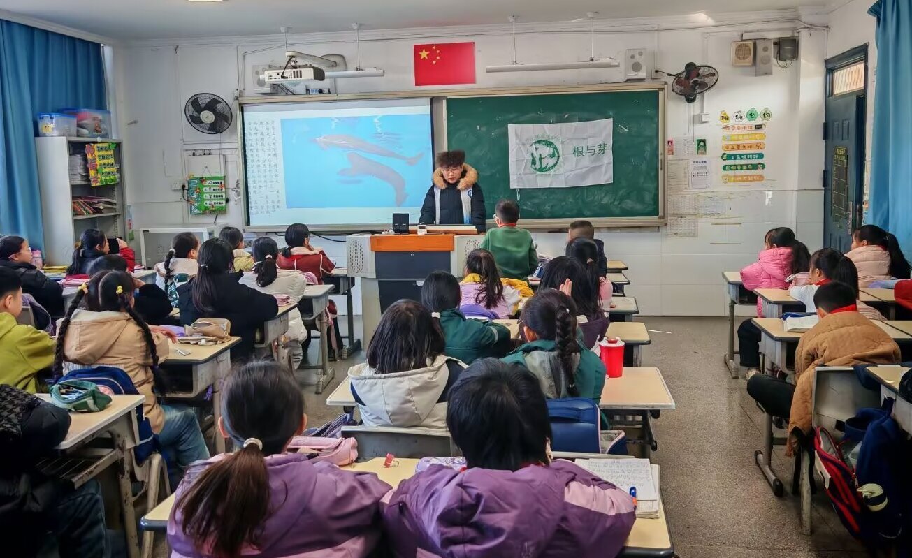 12月3日下午,安徽师范大学环境保护协会“根与芽”部门志愿者走进芜湖市马塘小学,面向小学生开展长江江豚科普宣讲。