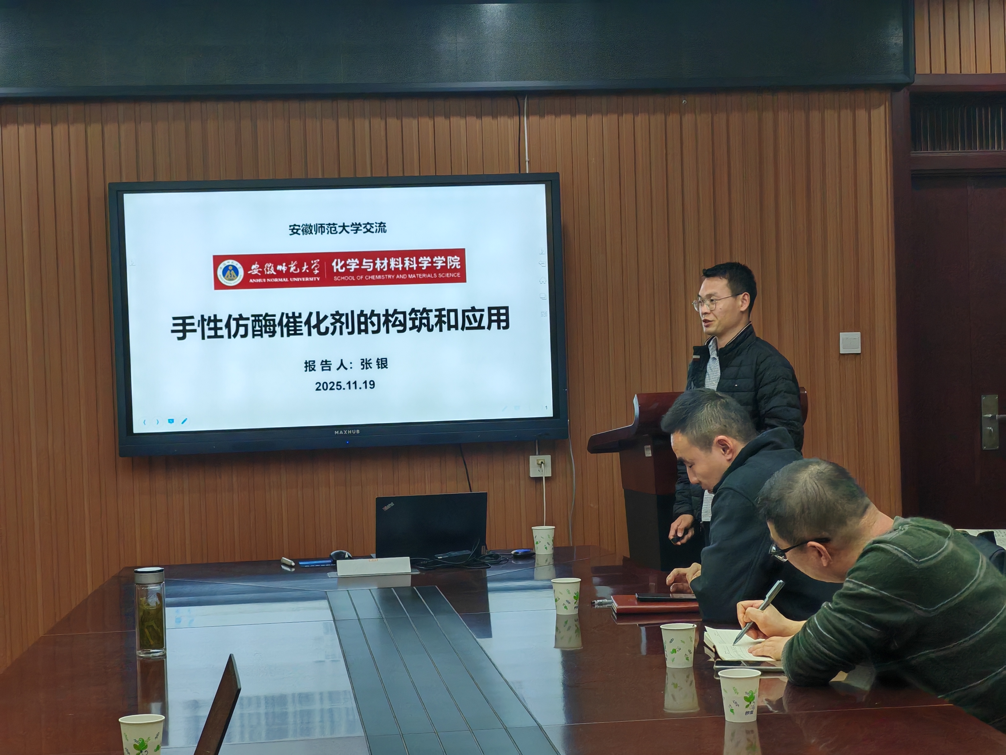 张银副教授了题为“手性仿酶催化剂的构筑和应用”的学术报告。张教授首先介绍了催化剂的精准构筑这一核心问题,通过有序组织不同功能单元,成功构建了非金属活性中心异相催化体系,提出了普适性的手性仿酶加氢催化剂构筑新方法。其中在应用拓展方面,张教授团队创新性地设计了手性仿酶光催化剂,利用光氧化还原性与氢键协同作用,首次实现了双自由基不对称交叉偶联反应,该成果在自由基反应机制研究方面具有前瞻性。并且为深入解析催化机制,张教授团队构建了仿酶氢键组装模型并建立高压原位红外测试条件,揭示了手性组装体的可逆组装机制与氢气活化路径。通过发展双变量协同调控策略,实现了对多组分反应中化学选择性与立体选择性的精准操纵,为手性药物绿色合成提供了新范式。会后,张银副教授与会师生展开了一系列学术讨论,并回答了与会师生提出的问题。