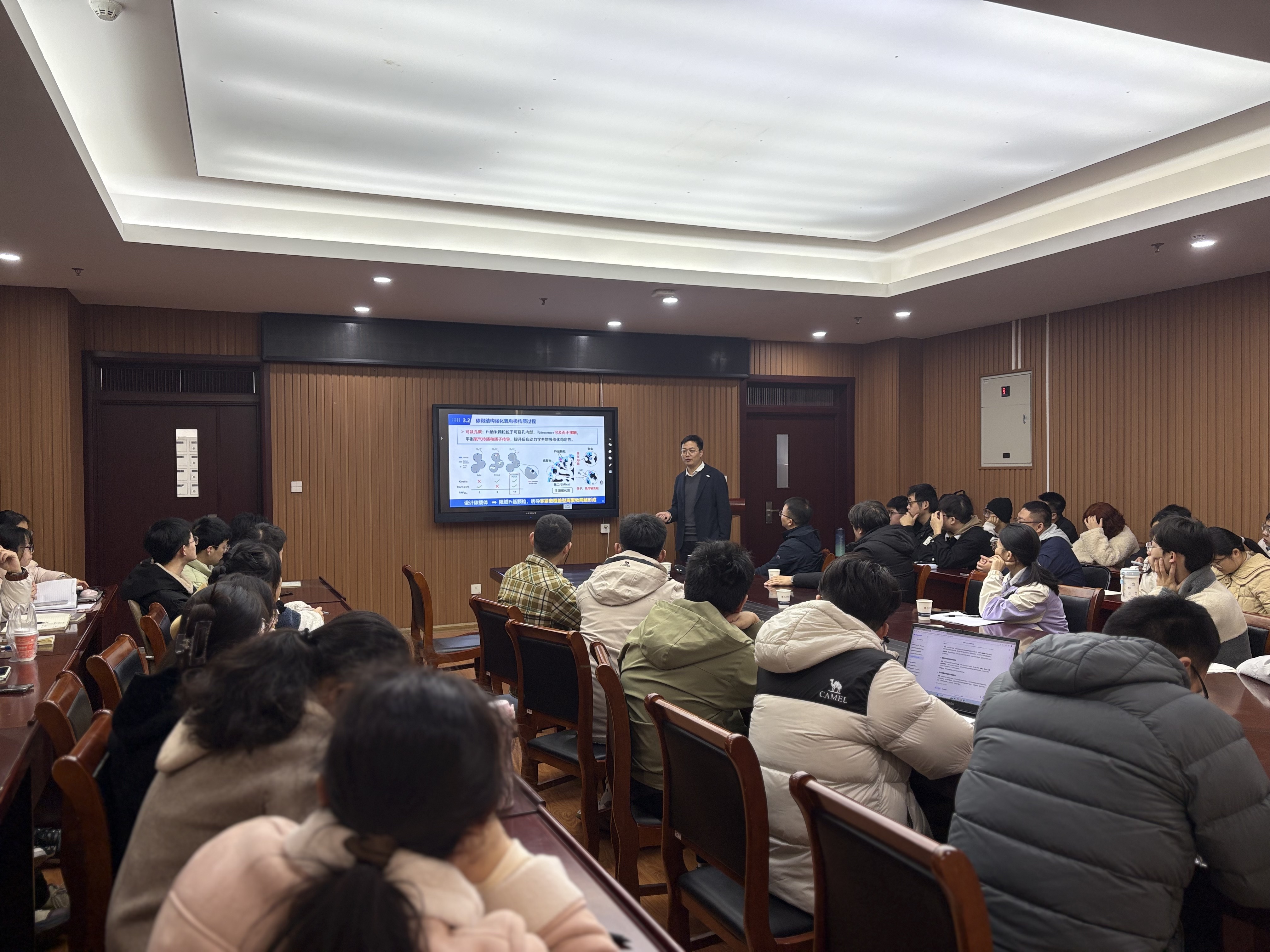 胡传刚教授作了题为“碳微结构调控与绿色能源催化”的学术报告。胡教授围绕“双碳”目标下的氢能及CO2转化展开研究,指出氧电极反应动力学缓慢是水电解与燃料电池能效提升的核心瓶颈,而碳材料因地壳丰度高、结构可调性强,在能源催化领域潜力显著。其团队的核心研究思路是通过碳基材料的本征结构调控(如端口掺杂)、组装结构构筑产生并暴露活性位点,最终实现器件级应用。研究基础涵盖了2021-2025年碳基材料活性位调控的系列成果:通过N,S掺杂碳管端口实现“高活性端口+高结晶管壁”分工,既提升氧还原反应性能又实现高效稳定的纯H2O2制备;针对酸性氧电极材料痛点,提出“碳褶皱结构”策略并结合Pt3Co金属间化合物,使催化剂达到超30万圈CV稳定性,设计“可及孔碳(Nest carbon)”载体平衡传质与质子传导;在氢氧化反应(HOR)中,以“半剥离”碳纳米管负载PtPd原子壳-PdCu空心核,催化剂质量活性达商业Pt/C的5倍,通过碳微结构构筑一体化电极实现低Ir/r比例催化剂的高效稳定析氧反应(OER);在耦合反应领域,依托连通介孔碳构建Cu团簇与单原子位点实现尿素高效合成。报告最后总结,该研究建立了功能分离碳基材料的活性位点调控方法,探明了位点分离的催化机制,为高效催化剂的器件应用与放大生产提供了理论与实验基础。会后,胡传刚教授与参会师生展开了深入的学术讨论,并回答了大家提出的问题。